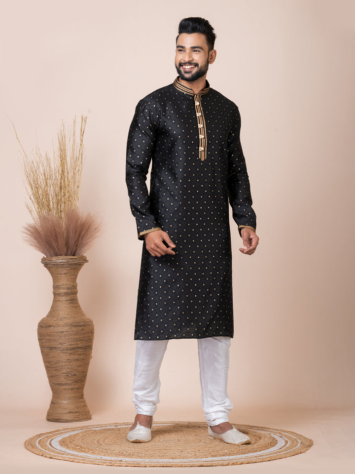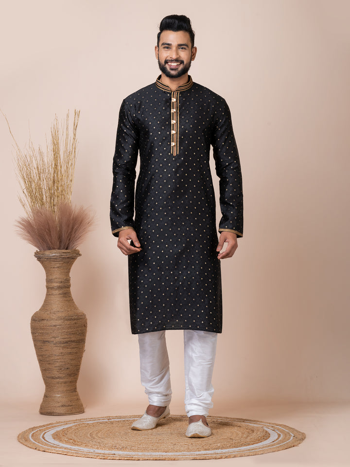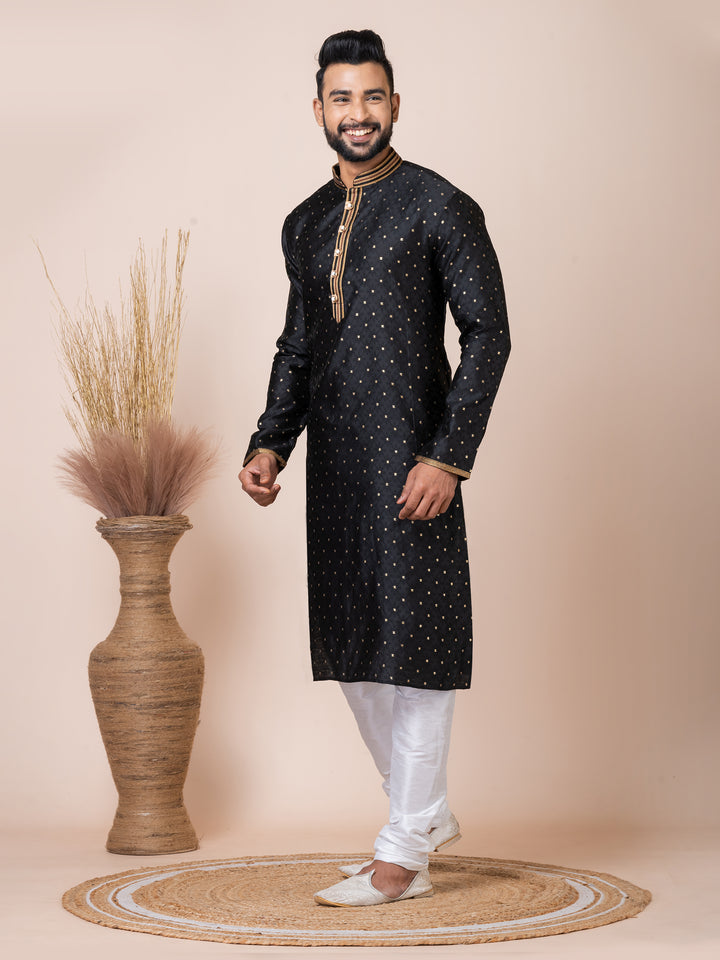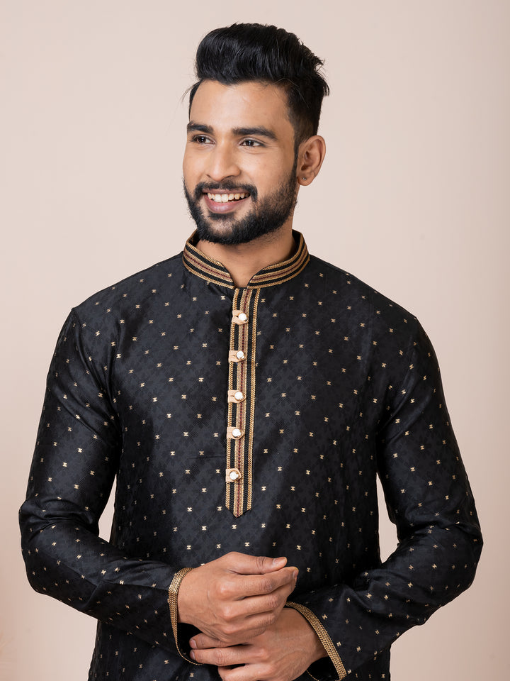 Command attention with timeless elegance in this Black and Gold Embroidered Kurta set. Richly crafted in a glossy fabric, the kurta features intricate golden buti embroidery throughout, creating a regal pattern that catches the eye. The highlight is the designer placket with golden loop buttons and a striped collar that brings a statement finish to the traditional silhouette.