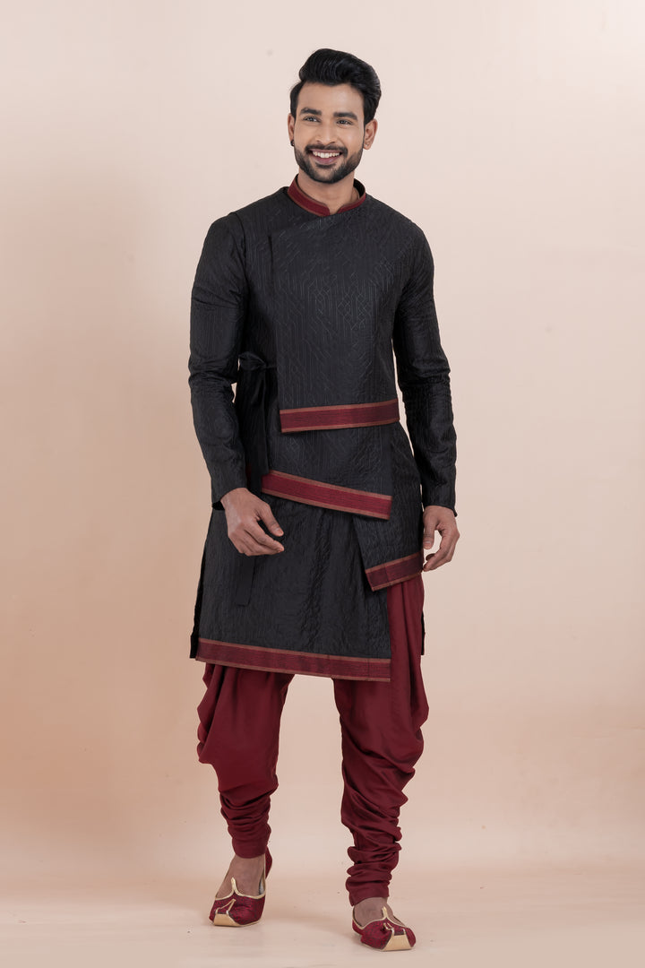 Make a bold statement with this uniquely designed Black Asymmetric Kurta Set, tailored for the modern man with a flair for tradition. Crafted in a premium textured fabric, the kurta features a striking asymmetric cut with layered maroon detailing and a side-tie closure that adds a contemporary twist to ethnic wear. The set is paired with a rich maroon dhoti pant, offering a stylish yet comfortable drape.