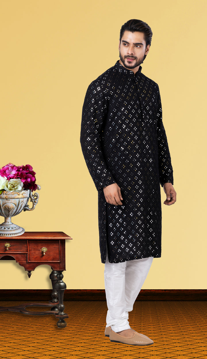 Command attention in this bold black kurta set by Angasudha, adorned with dazzling diamond-shaped mirror embroidery across a rich georgette base. The contrast of crisp white dupion silk pyjama completes the look, making it ideal for evening functions and festive glamour.