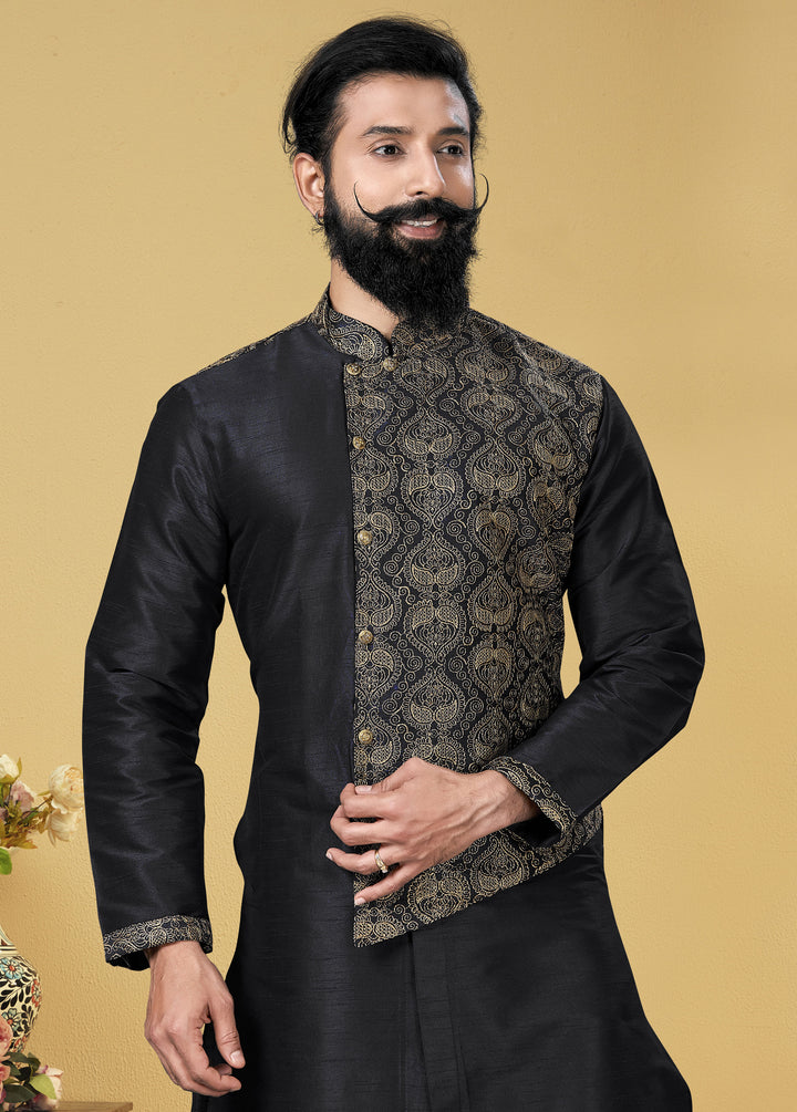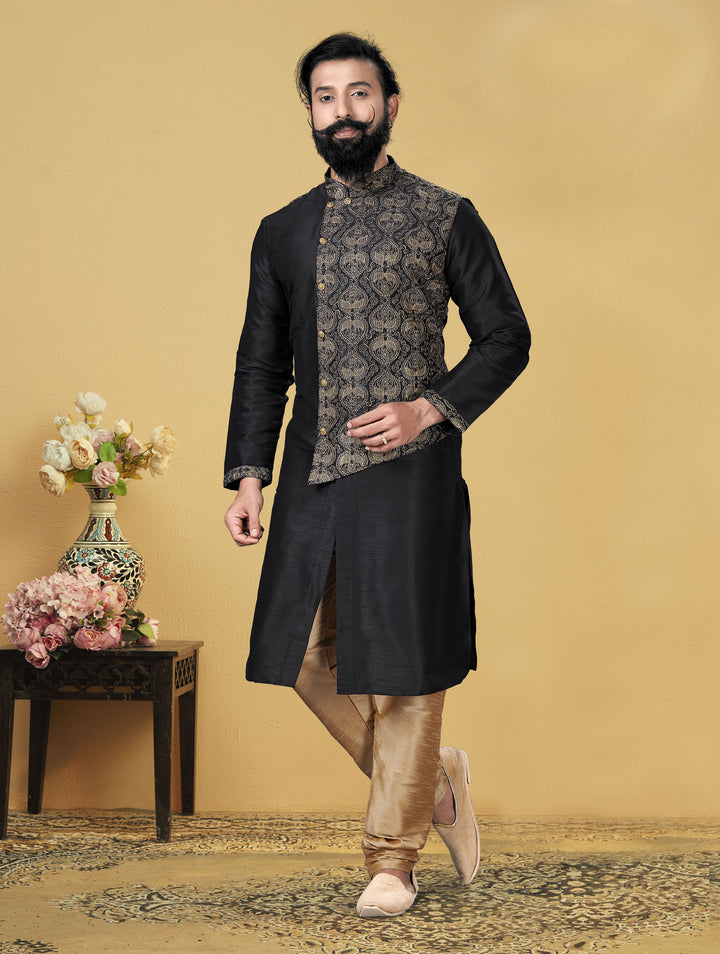 Command elegance with a bold edge in this black embroidered asymmetric kurta pyjama set — a stunning fusion of tradition and contemporary design. The kurta features a richly detailed jacquard panel embroidered with intricate gold motifs, gracefully offset by a plain silk base. The asymmetric button placket and mandarin collar add sophistication, while the golden beige churidar pyjama complements the ensemble with a luxurious finish.