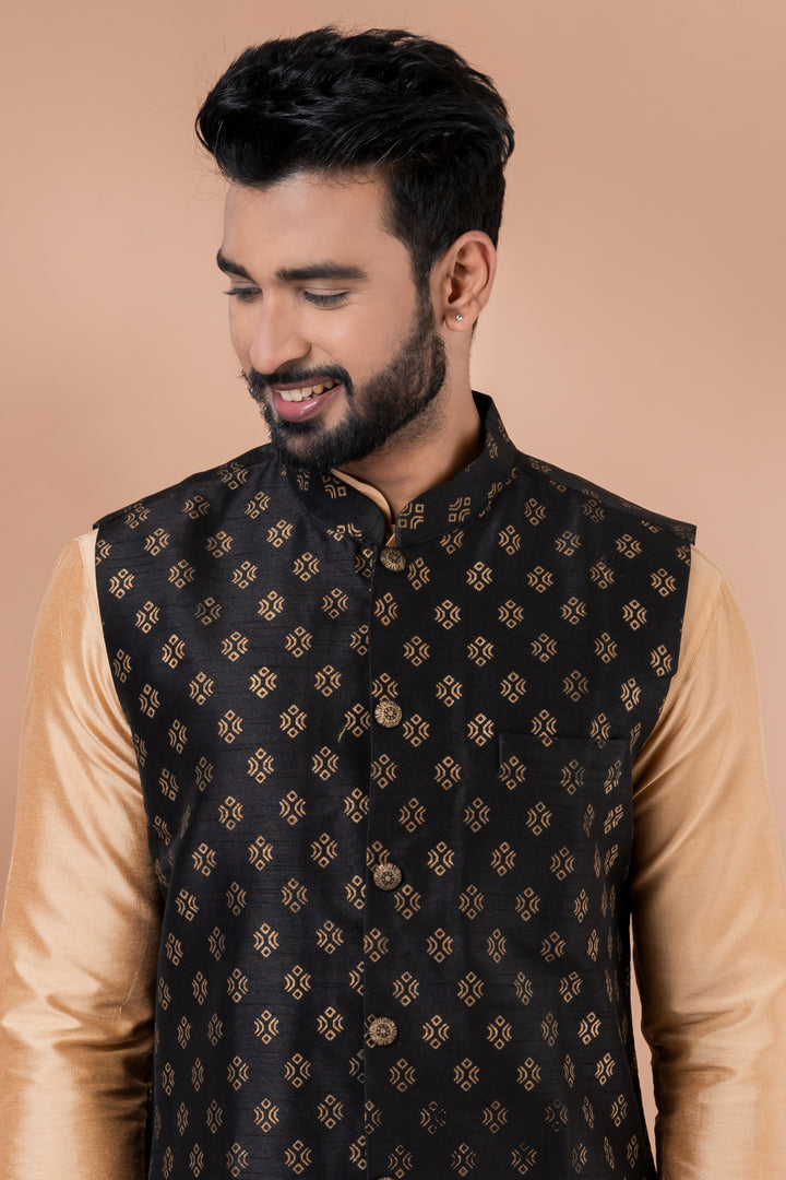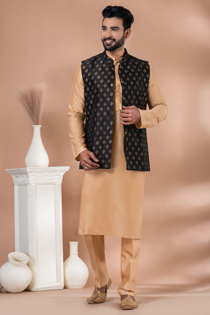 Angasudha Black Gold Brocade Waistcoat with Beige Kurta Pyjama Set