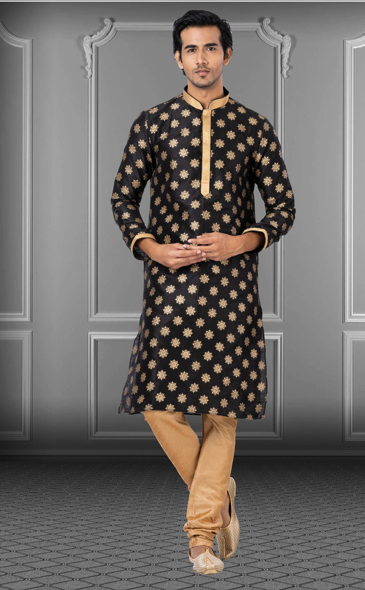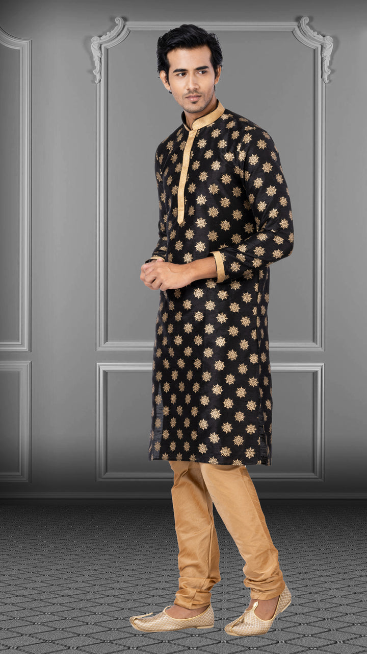 Radiate grace and grandeur in this black Dupion print kurta, lavishly embellished with golden floral motifs that exude royal charm. The shimmering texture of premium Dupion fabric enhances the richness of the deep black tone, while the gold detailing on the collar, placket, and cuffs adds a regal finish.