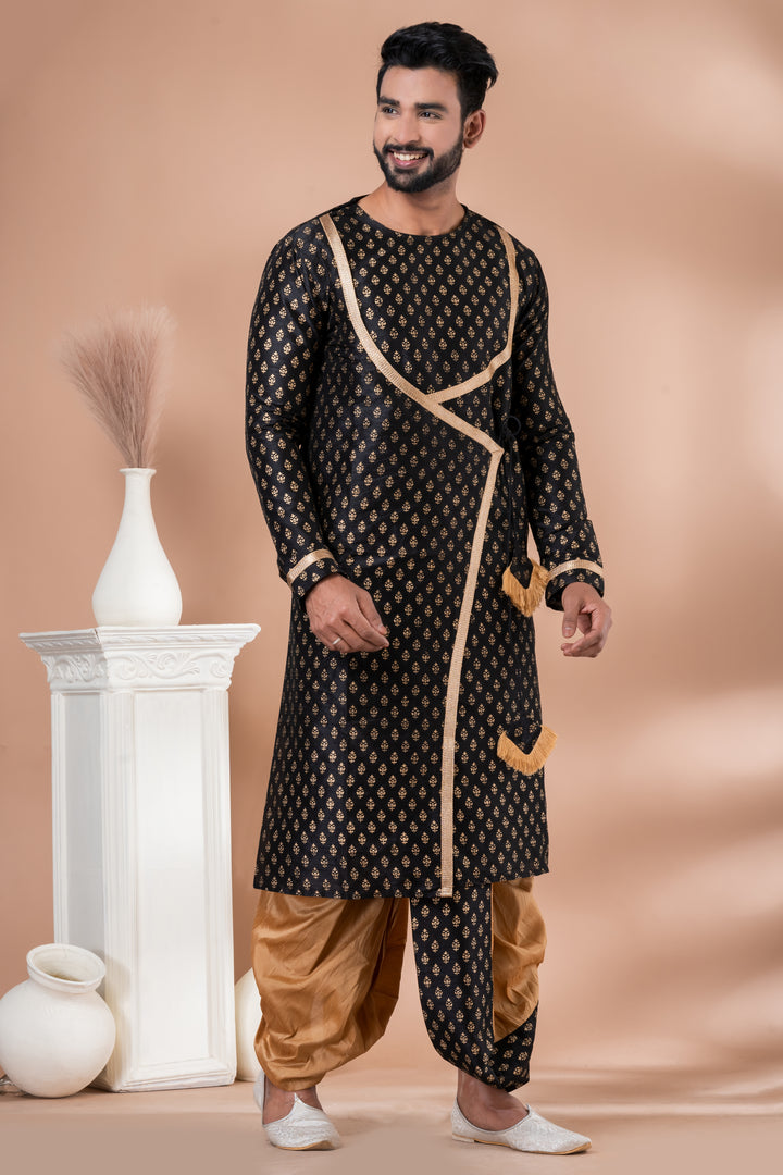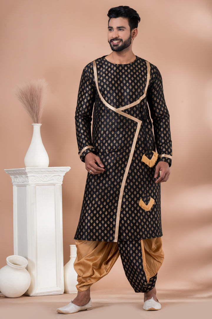 Command attention with the Angasudha Black Indo-Western Dhoti Kurta Set, designed for the modern man with a flair for tradition. The kurta features an eye-catching asymmetrical wrap design, crafted from luxurious black fabric adorned with gold foil print motifs and embellished with gold border detailing and tassels for a statement finish.