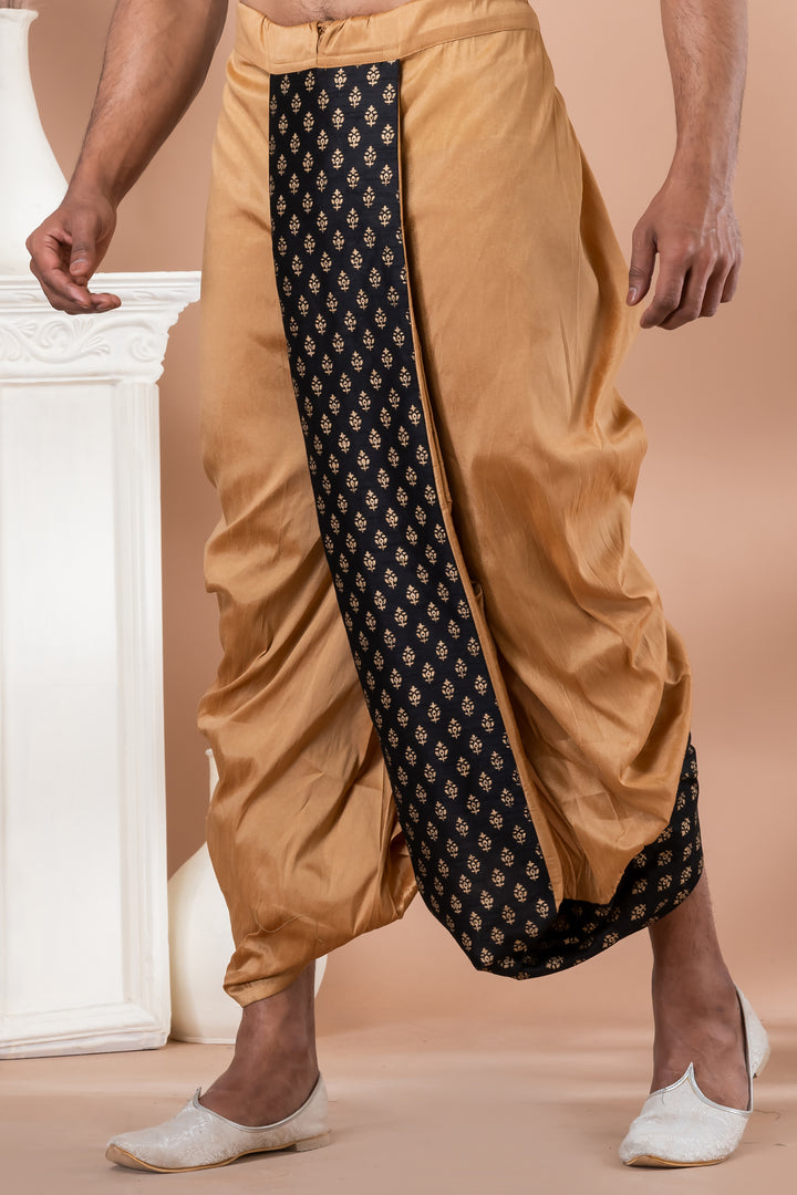 Dhoti Fabric: Dupion Silk blend in golden hue with matching print detailing
