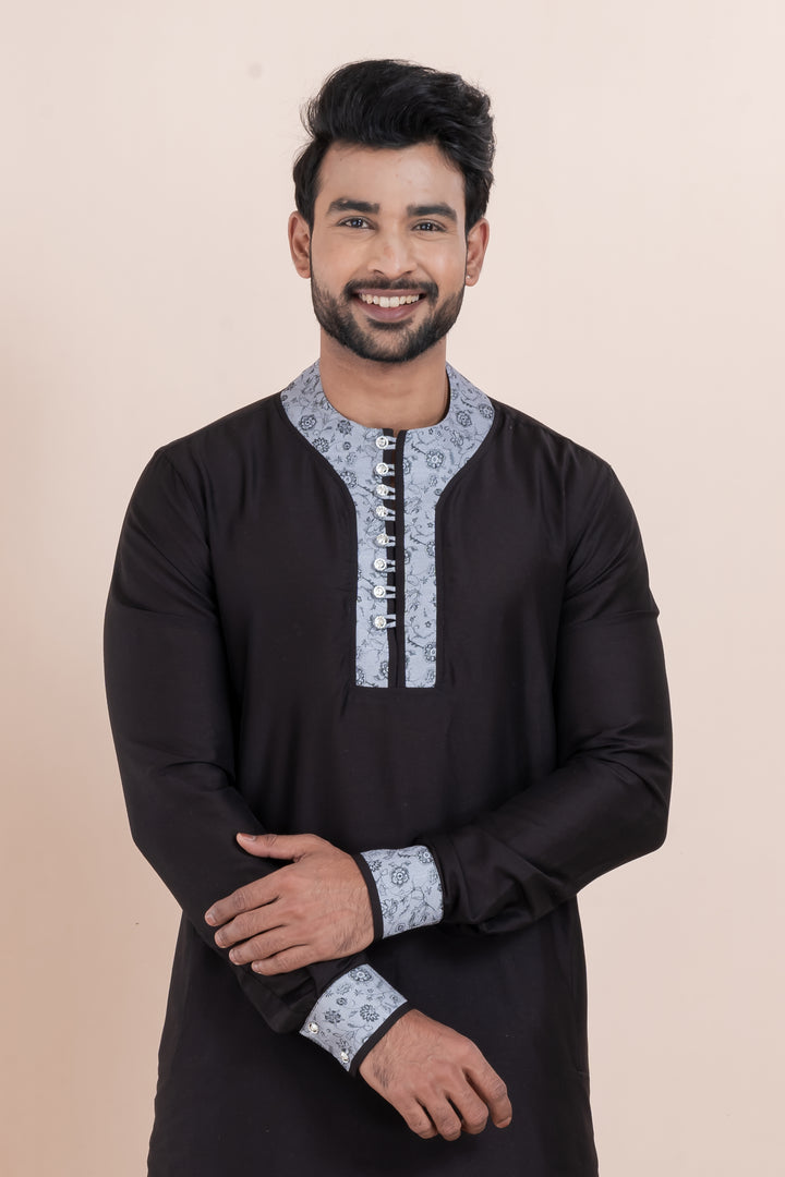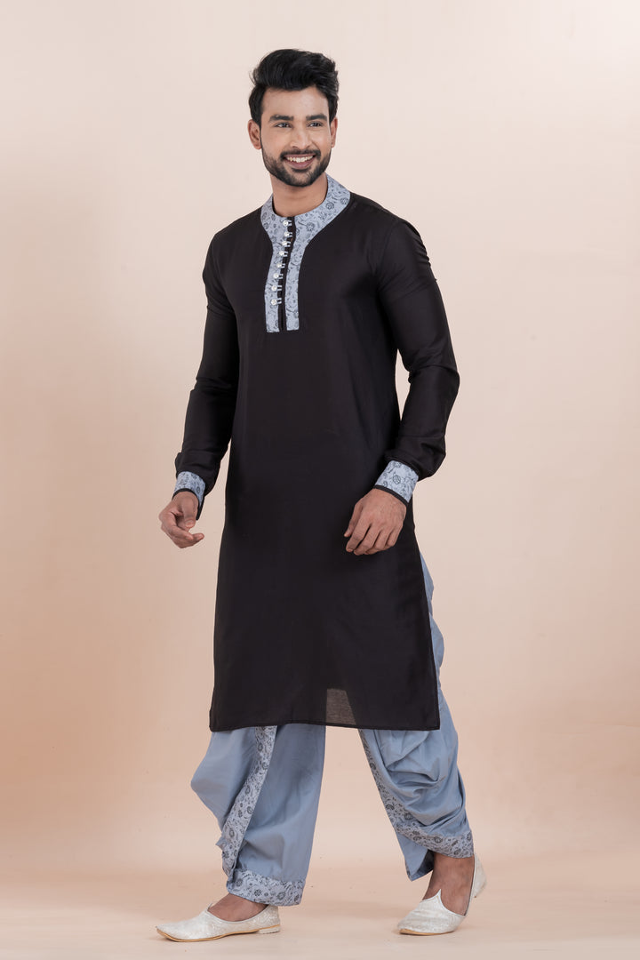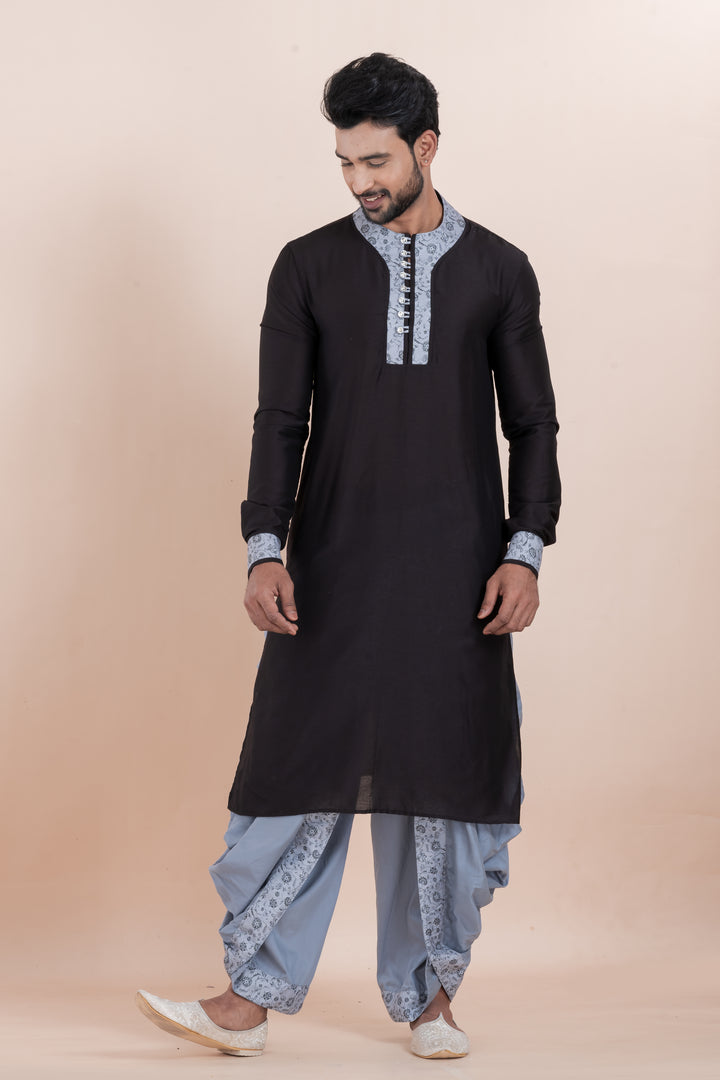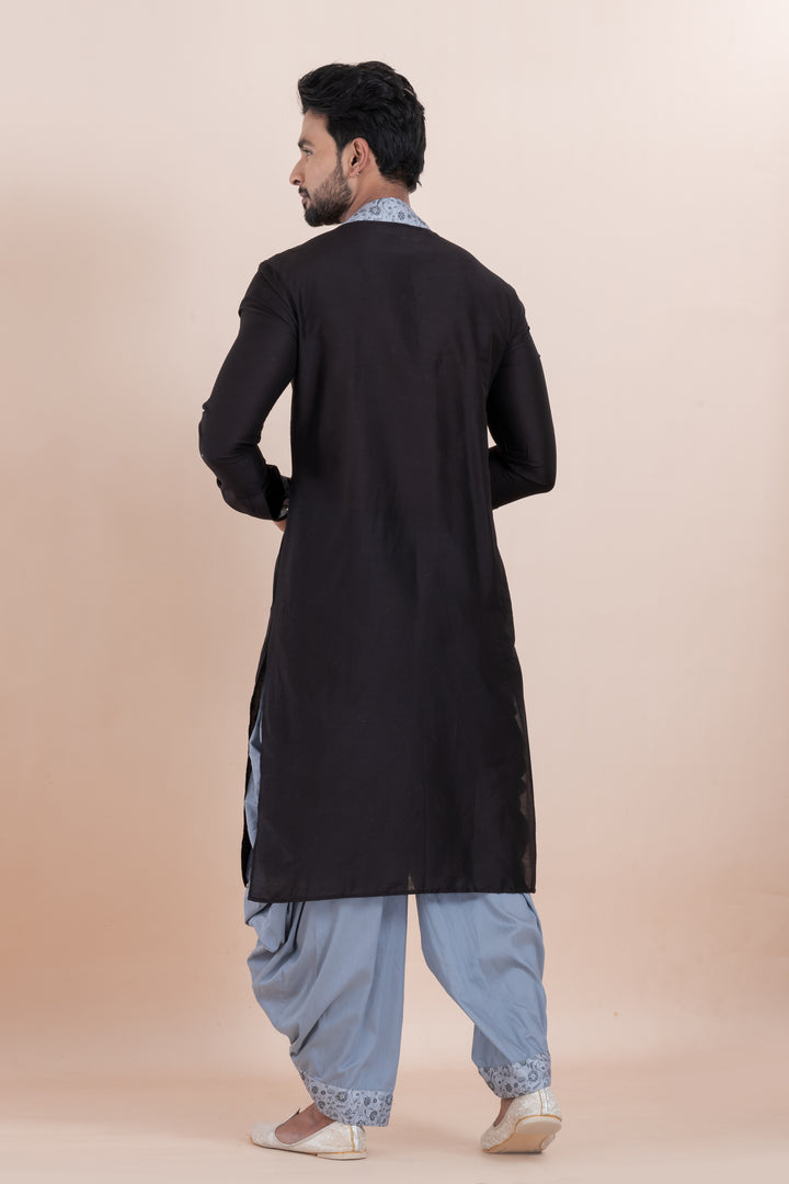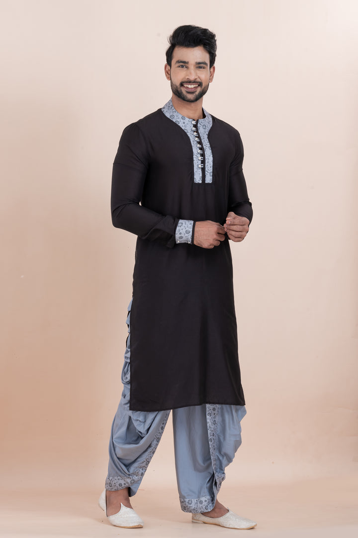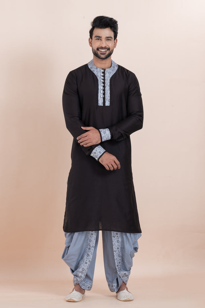 Classic meets contemporary in this Black Kurta with Sky Blue Dhoti Set, crafted for the modern man who appreciates timeless elegance with a twist. The kurta, made from a rich, smooth fabric, features a clean silhouette enhanced by sky blue floral printed detailing on the neckline and cuffs — offering a subtle yet striking contrast.