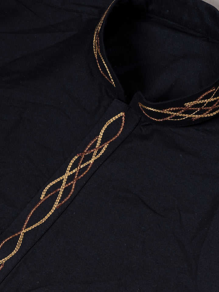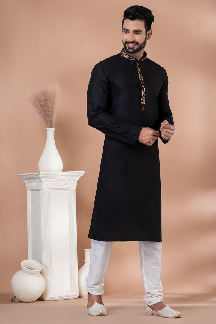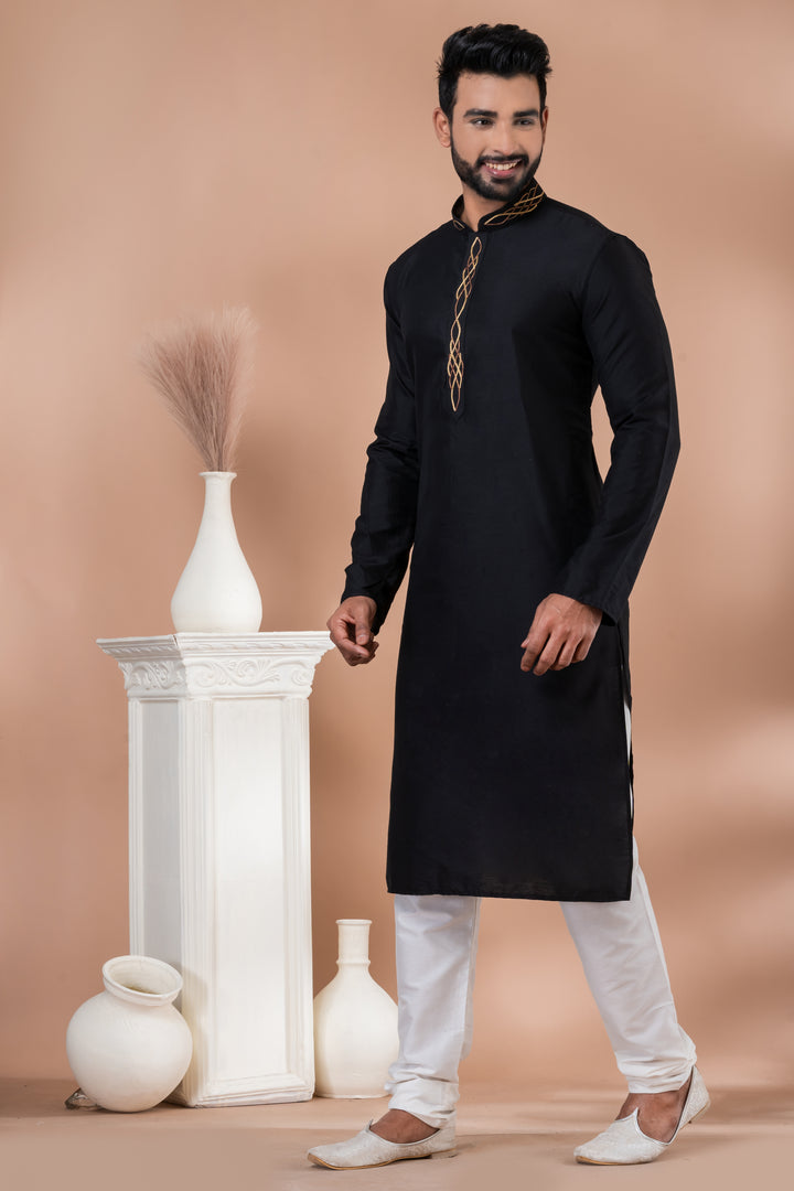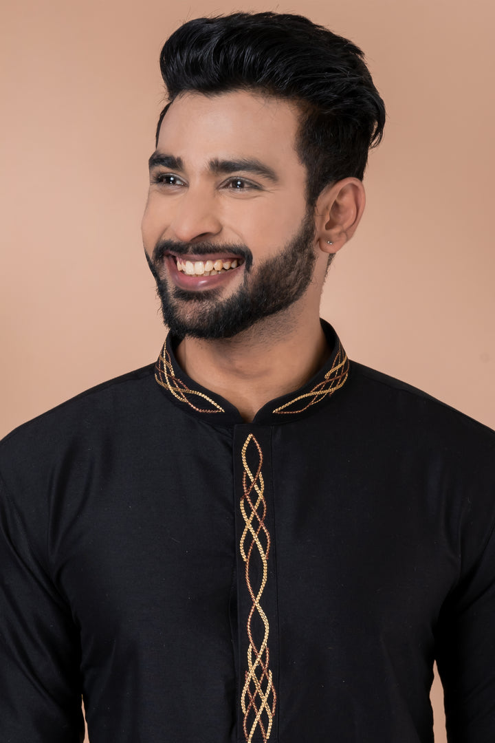 Make a bold style statement with the Angasudha Black Kurta Set, crafted in smooth viscose fabric that combines elegance with comfort. The rich black kurta features striking golden thread embroidery on the placket and mandarin collar, creating a sharp contrast that exudes sophistication.