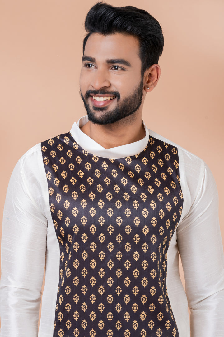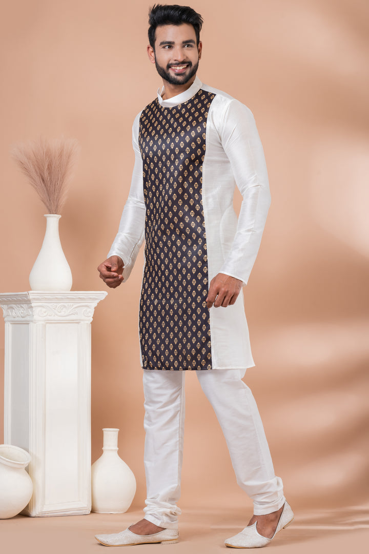 Bring sophistication to your festive wardrobe with the Angasudha Black & White Banarasi Kurta Set. This stunning kurta features a rich black Banarasi dhupion silk front adorned with intricate golden motifs, beautifully contrasted by pristine white Dupion Silk sleeves and back. Paired with a crisp white pyjama, this ensemble strikes the perfect balance between classic tradition and bold elegance.
