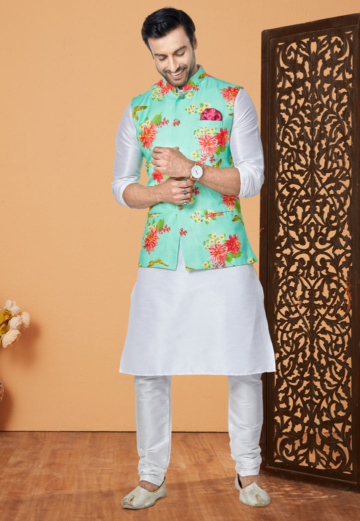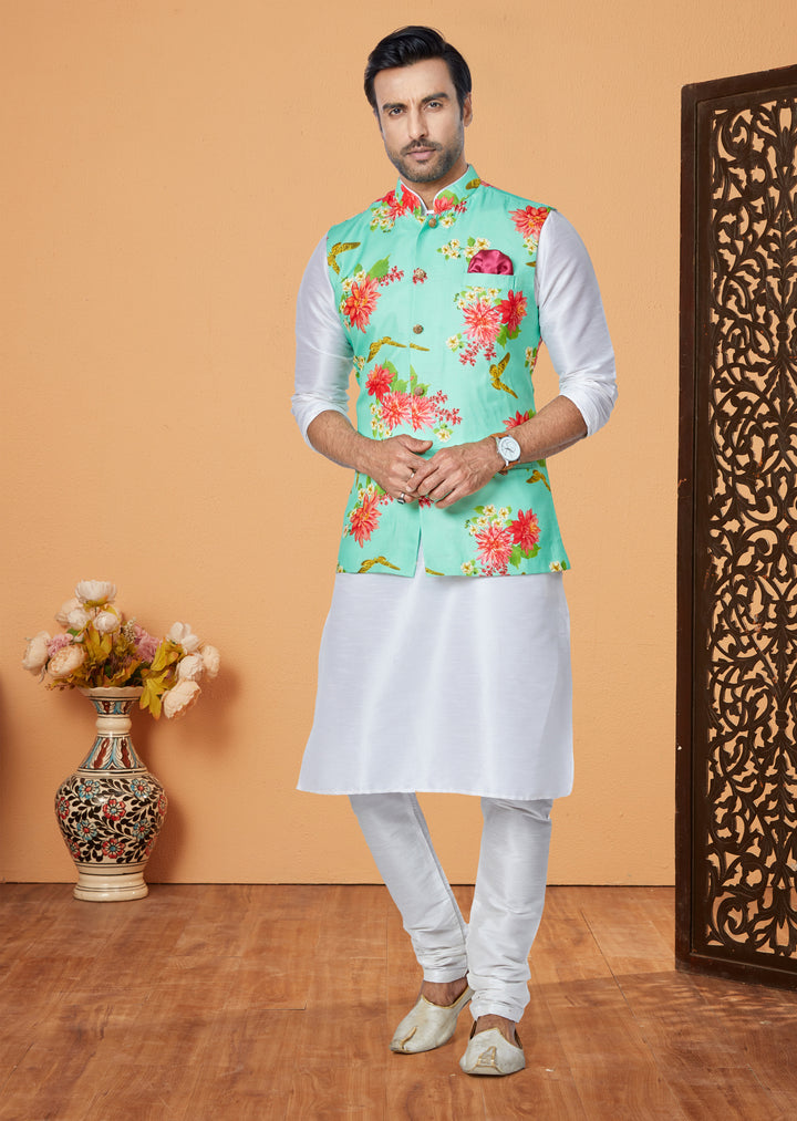 Angasudha Blossom Mint Floral Digital Waistcoat with Dupion Silk Kurta Pyjama Set