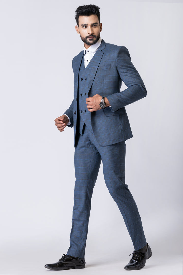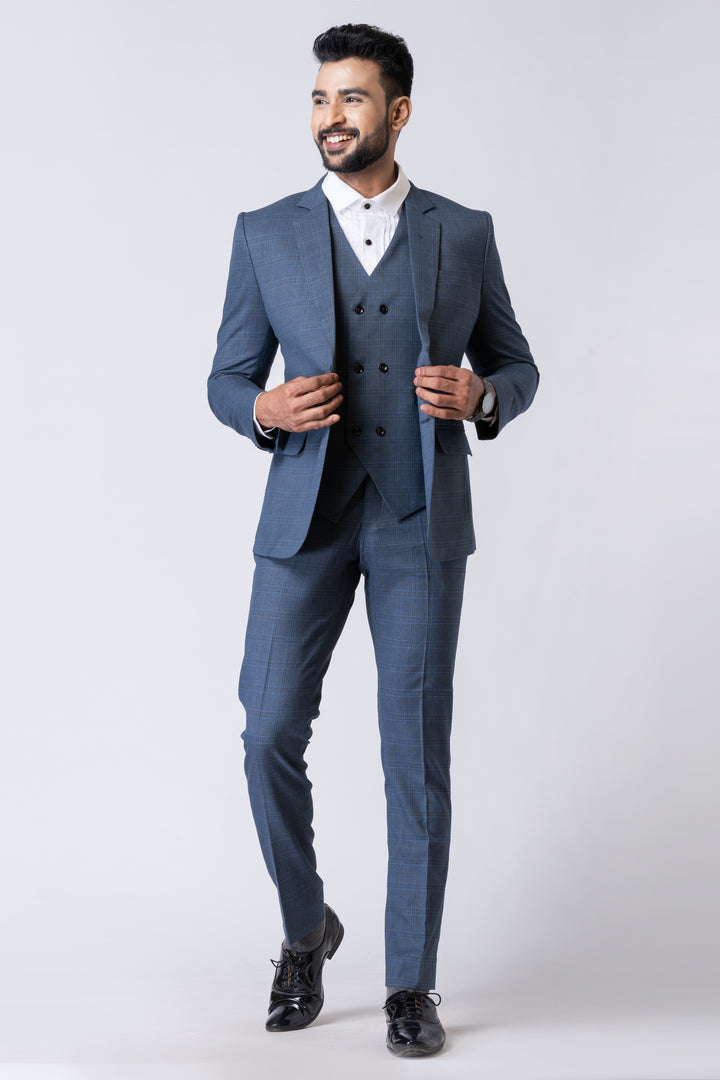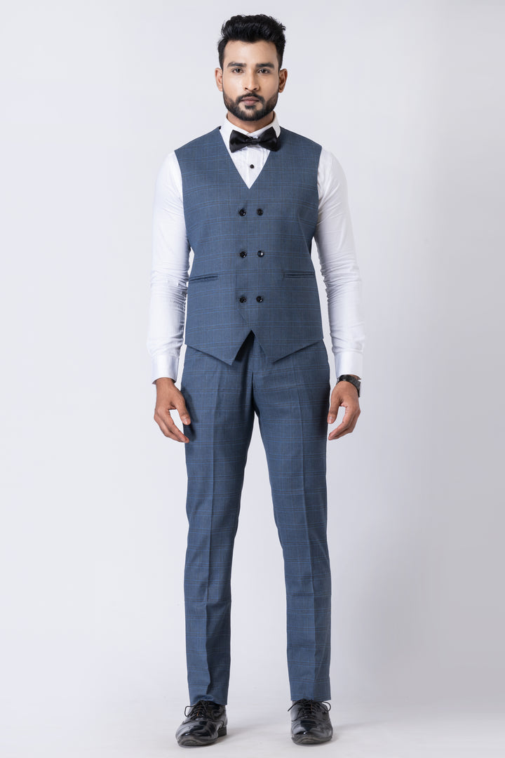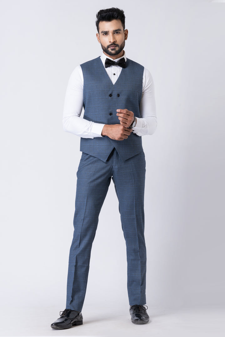 Make a confident style statement with the Angasudha Blue Checkered Tuxedo Suit Set — an ensemble that blends timeless tailoring with contemporary charm. Crafted from premium Polystar Mix fabric, this 3-piece suit features a subtle checkered pattern that adds depth and sophistication to your formal look.