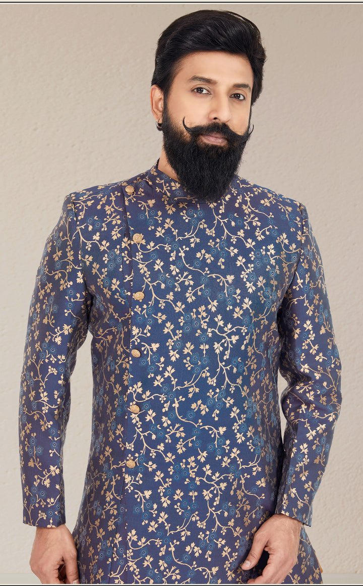 Unveil floral royalty in this exquisite Angasudha Indo Western set, designed for the modern gentleman who appreciates classic charm. Featuring a luxurious navy blue top adorned with intricate golden floral embroidery and an asymmetrical hemline, this piece speaks of elegance and finesse. The look is completed with golden silk dhoti pants that add flow and traditional flair.