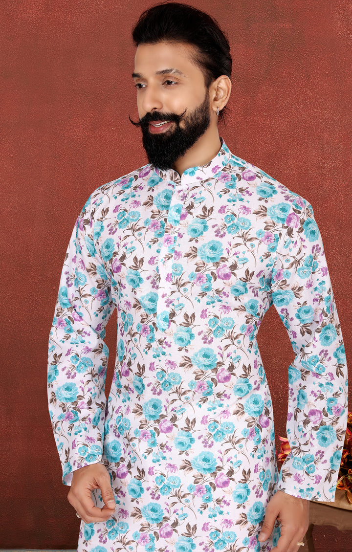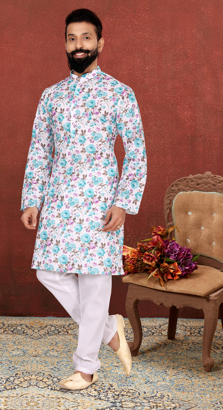 Celebrate freshness with floral finesse in the Blue Petal Bloom Kurta Set. This kurta features an elegant all-over digital print of turquoise blue and lilac blooms with leafy accents on a soft white cotton base, making it a standout for summer festivities. The crisp white Dupion Silk pyjama adds a clean and classic finishing touch.