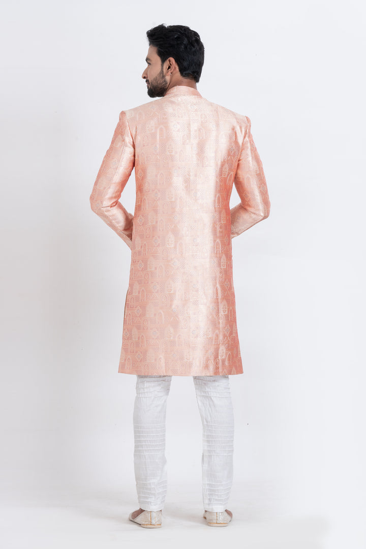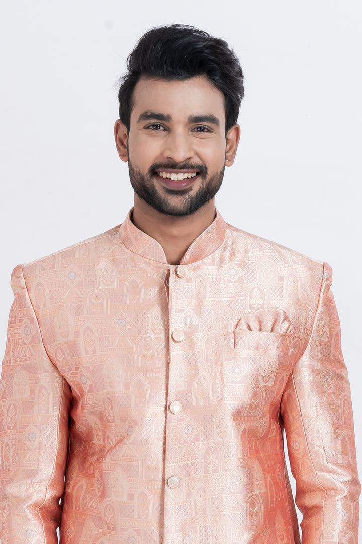 Drape yourself in elegance with the Blush Aura Indo Western Set, a soft yet striking choice for festive and ceremonial occasions. Crafted in a luxurious peach-toned brocade, the kurta showcases intricate woven patterns inspired by royal architecture and subtle sequin detailing. Finished with a sleek bandhgala collar, concealed placket, and structured silhouette, it’s paired with a crisp white churidar to complete the classy ensemble.
