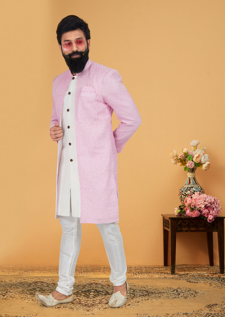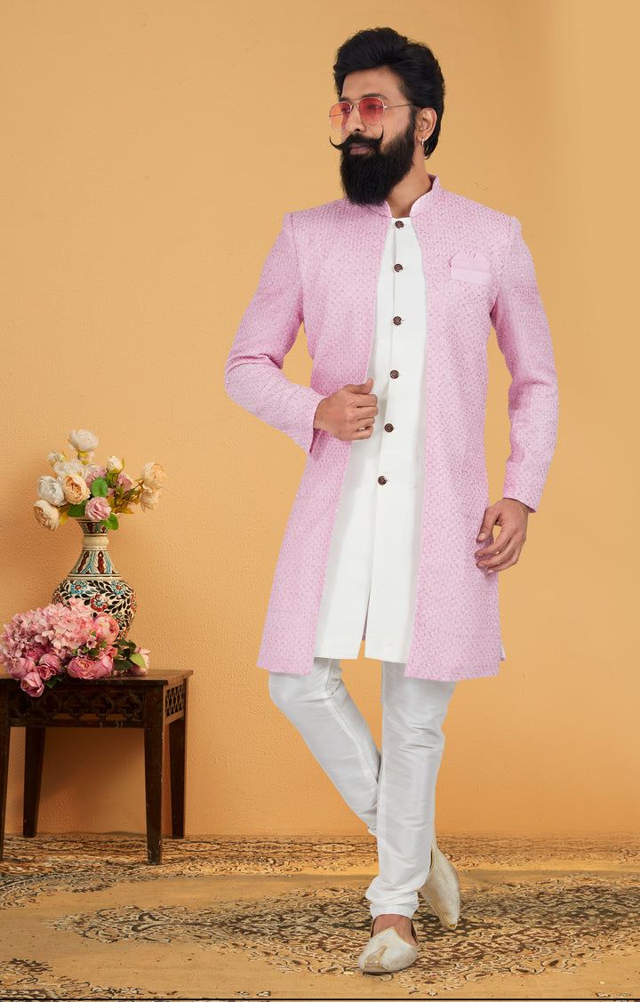 Turn heads in soft sophistication with the Angasudha Blush Bloom Indo-Western Set, tailored for men who want to infuse their festive look with pastel charm and modern elegance.