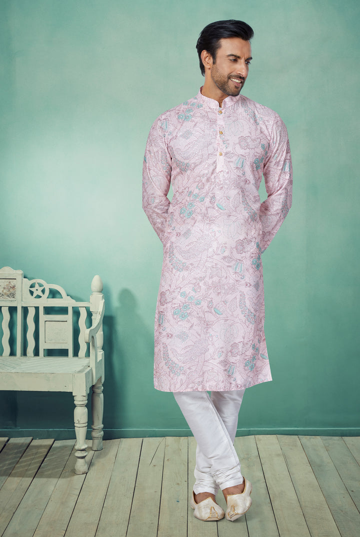 Add a gentle charm to your ethnic collection with this Pastel Pink Kurta, featuring an intricate floral and vine pattern in soothing aqua and lilac hues. Made from soft mono fabric and paired with a crisp white Dupion Silk Pyjama, this ensemble is ideal for daytime celebrations with a refined, graceful edge.