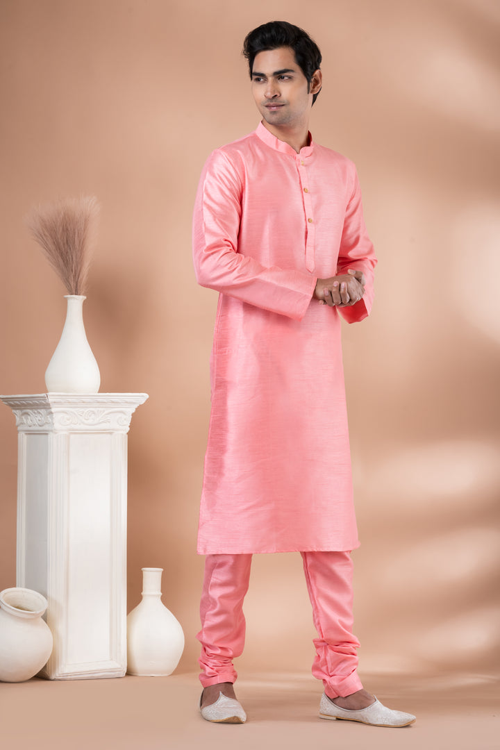 Soft, stylish, and effortlessly graceful—the Angasudha Blush Bloom Kurta Set is a charming pick for the modern man with a flair for color. Crafted from smooth Dupion Silk, this elegant kurta in a delicate blush pink hue features a subtle sheen, clean silhouette, and wooden button accents. The minimalist design makes it easy to wear across traditional and semi-formal events.
