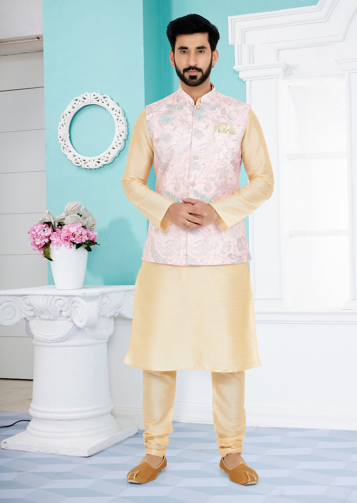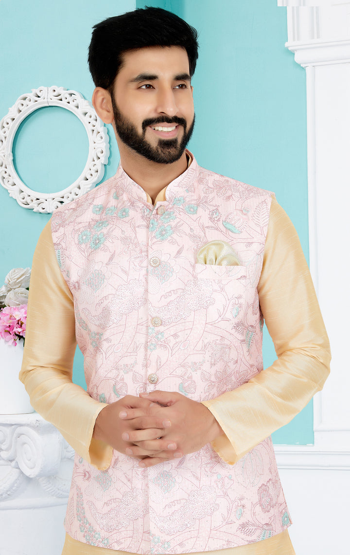 Bring charm and class to your traditional wardrobe with this peach-gold kurta pyjama set paired with a soft pink brocade waistcoat. The golden kurta-pyjama made from luxurious art silk offers a rich festive shine, while the jacquard-style waistcoat features intricate floral and bird motifs in pastel tones — ideal for sophisticated ethnic occasions.