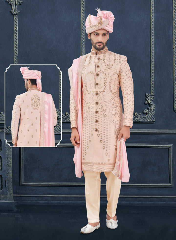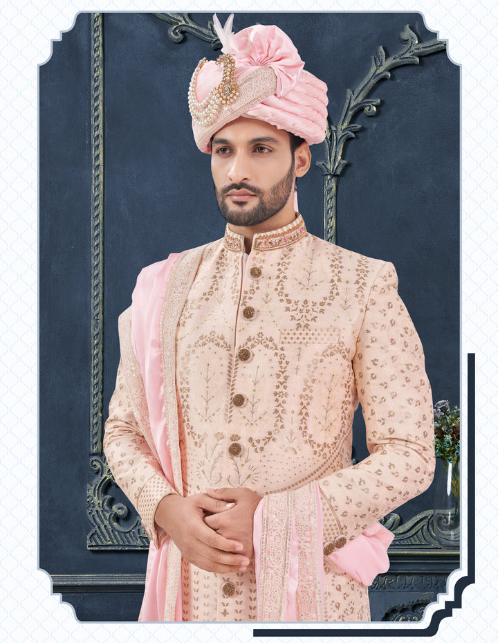 Elevate your wedding wardrobe with this Blush Pink Embellished Sherwani Set, designed for grooms who wish to make a refined statement on their big day. Ideal for marriage ceremonies, bridal receptions, sangeet nights, and engagement functions, this sherwani radiates regal charm through its soft pastel hue and intricate embroidery.