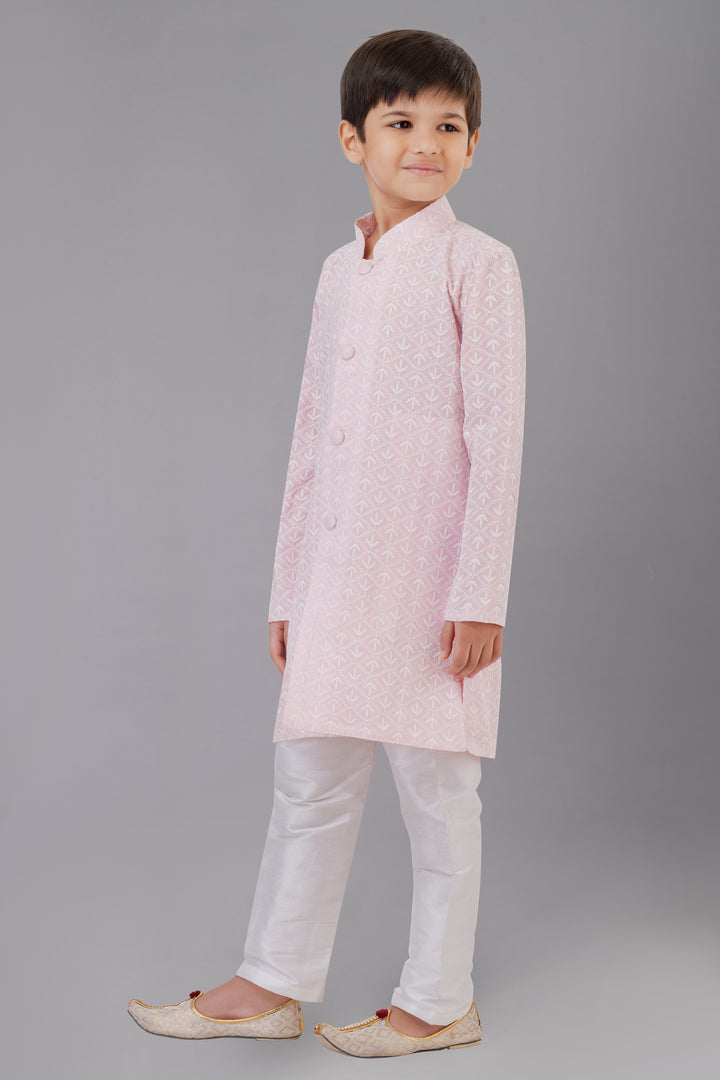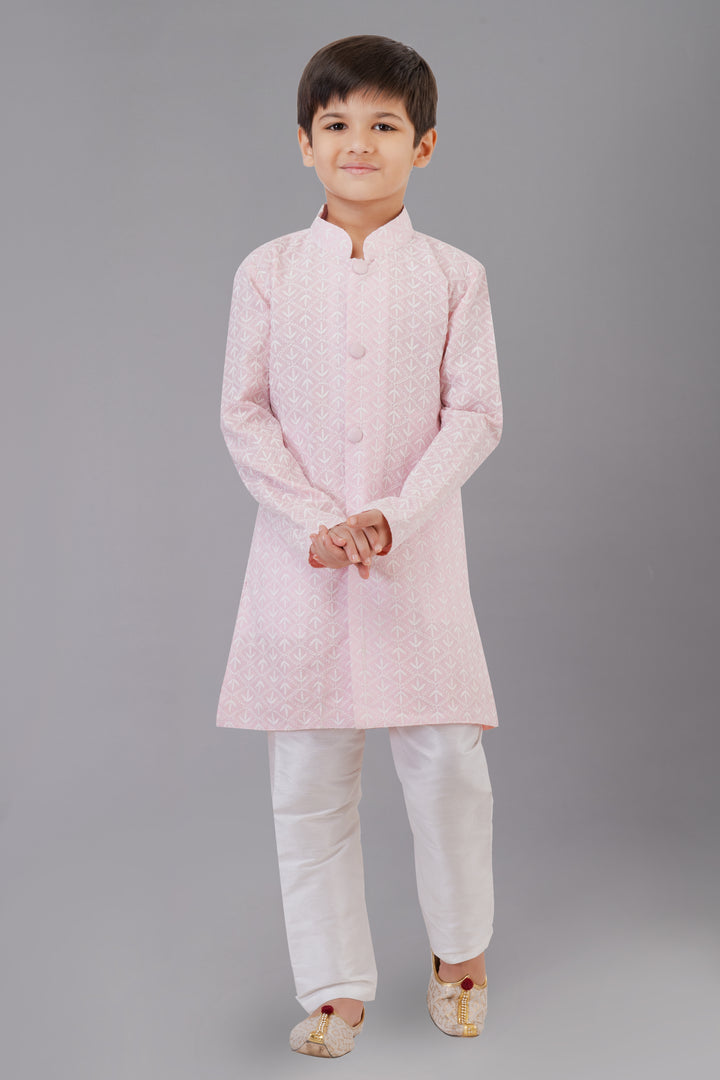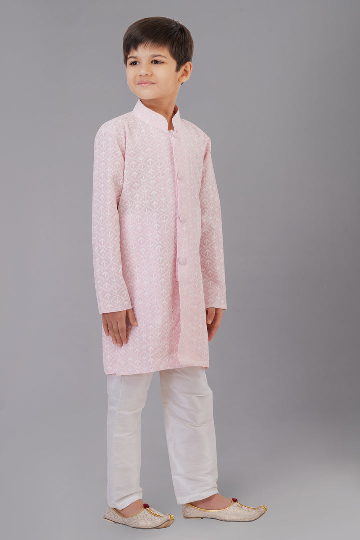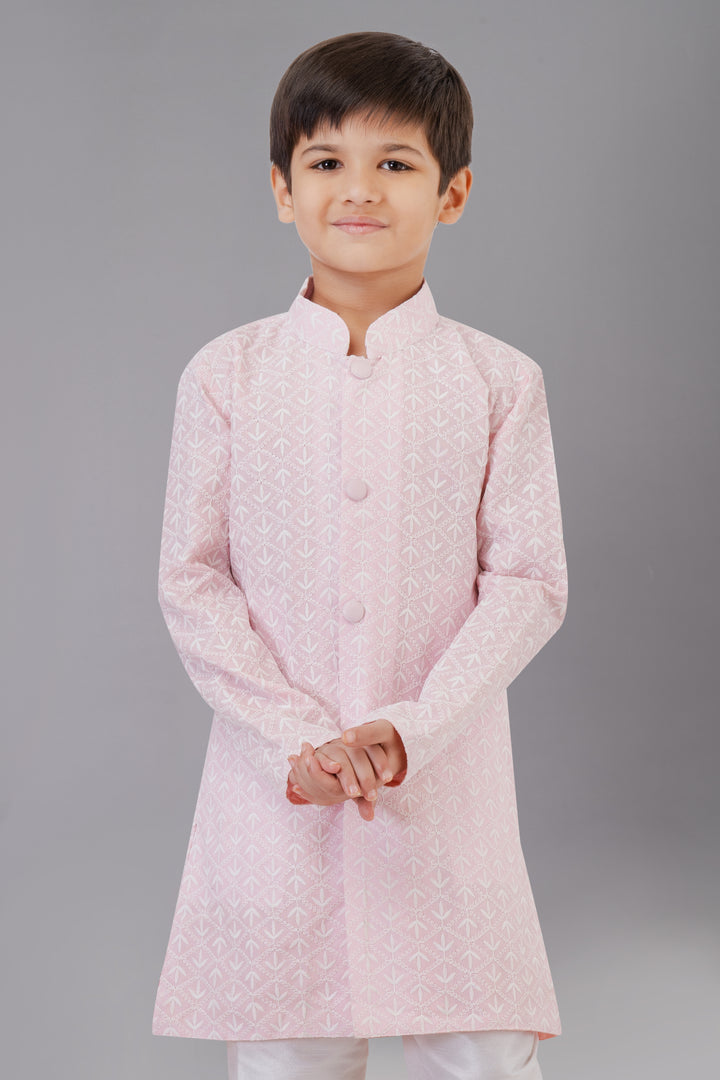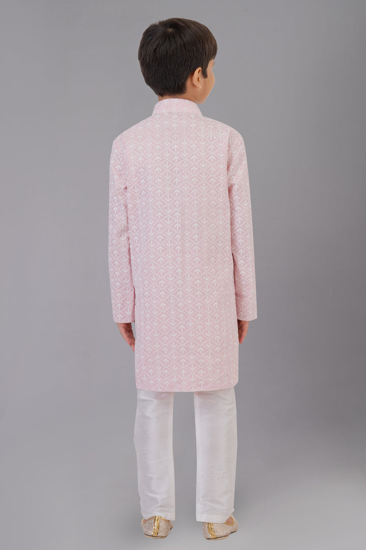 Add a touch of charm and elegance to your child’s ethnic wardrobe with this Blush Pink Printed Kurta Set. Crafted from premium fabric, the kurta features an eye-catching all-over geometric motif in white, perfectly contrasted by a classic white pajama. The soft pastel tone and comfortable design make it an ideal pick for festive occasions, family celebrations, or traditional events.
