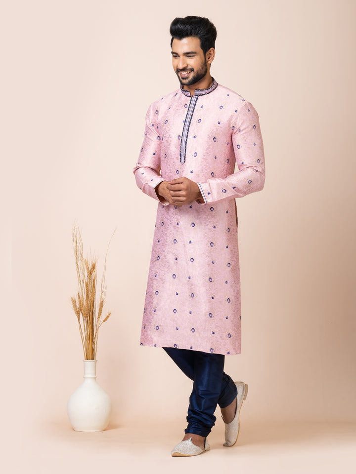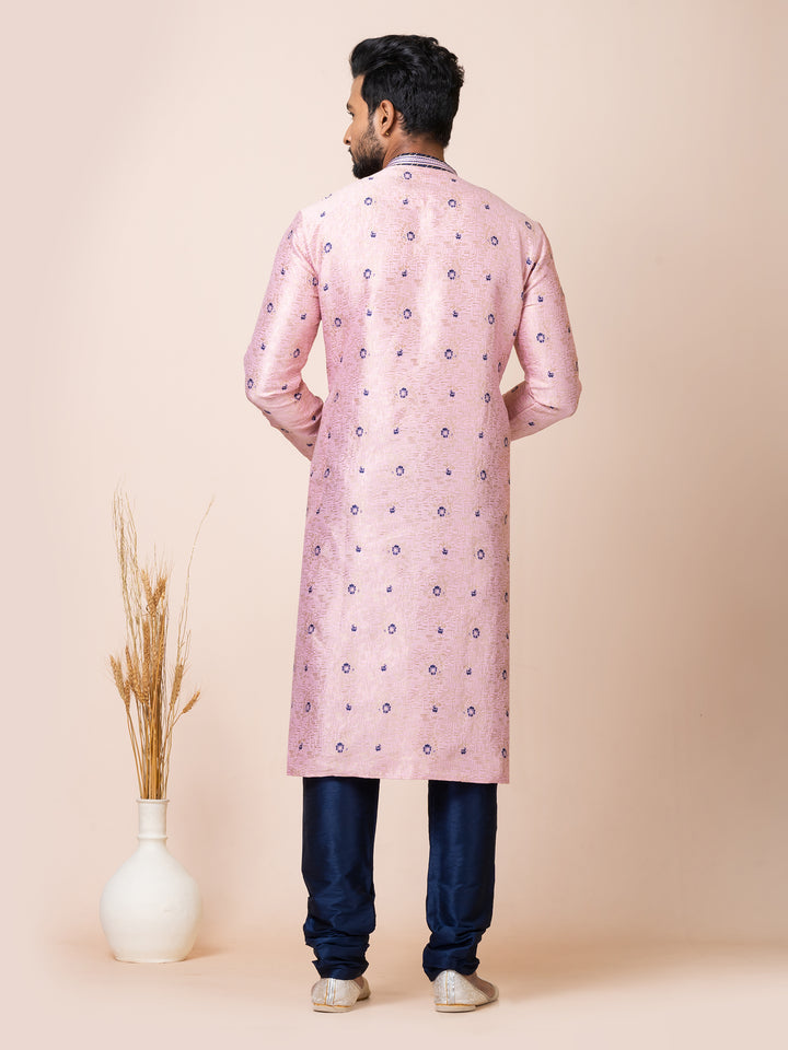Add a fresh pop of color to your festive wardrobe with this blush pink silk kurta, intricately adorned with navy floral motifs and geometric patterns. The elegant mandarin collar and finely embroidered placket add a sophisticated touch, while the deep navy churidar provides a bold contrast. This kurta set is ideal for daytime events, haldi ceremonies, or semi-formal celebrations, effortlessly blending charm with elegance.
