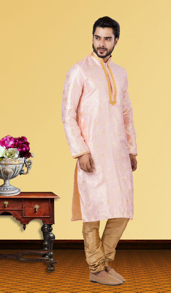 Drape yourself in festive finesse with this blush pink kurta from Angasudha, crafted in lustrous fabric featuring delicate all-over golden zari embroidery. The front placket with contrast detailing adds a regal touch, while the golden dupion silk pyjama perfectly balances the opulent look—ideal for wedding rituals or traditional occasions.