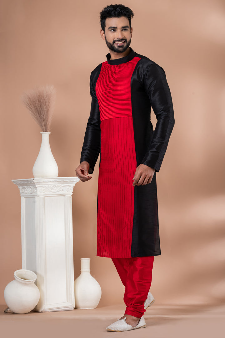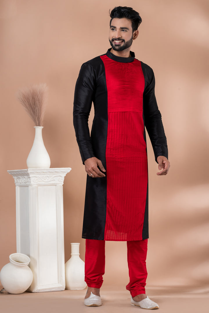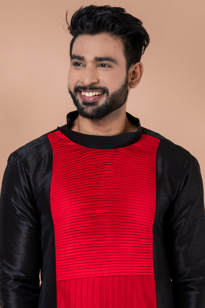 Angasudha Bold Black & Red Dupion Silk Kurta with Pintuck Detailing & Matching Red Pyjama