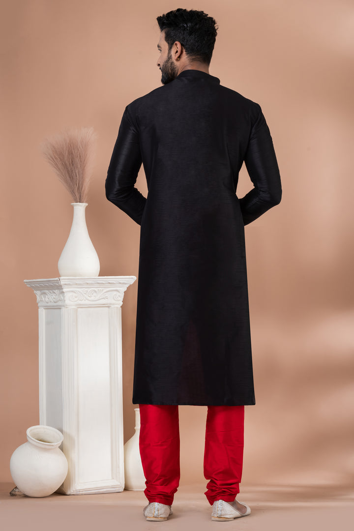 Make a striking style statement with the Angasudha Black & Red Kurta Pyjama Set, tailored for those who like to stand out. The kurta features a rich black base with a vivid red center panel, elevated with neat pintuck detailing for a textured finish. Made from premium Dupion Silk, it is paired with a bold red pyjama for a complete, power-packed ethnic look — perfect for festive nights, receptions, or special cultural events.