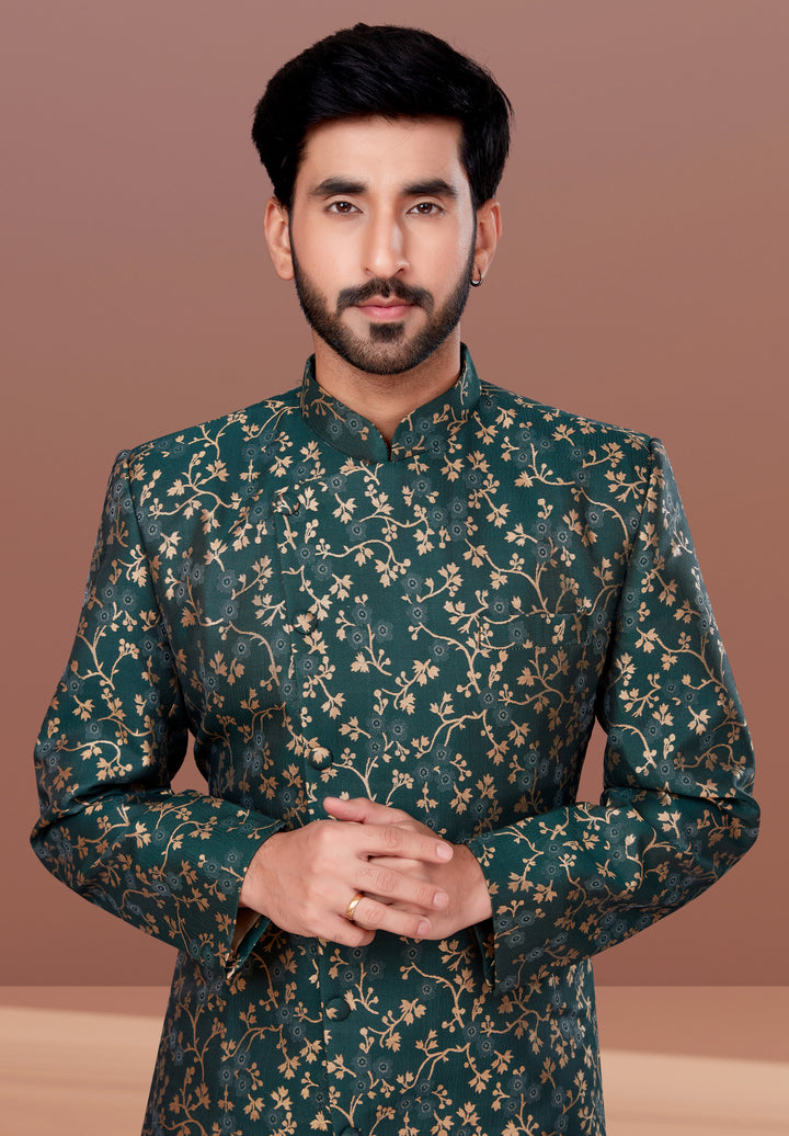 Angasudha Bottle Green Floral Brocade Indo-Western with Golden Dhoti