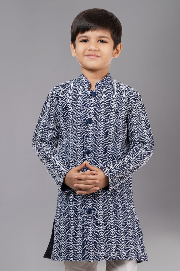 Dress your little one in timeless elegance with this stylish Boys' Blue Printed Kurta and Cream Churidar Set. Featuring a beautifully detailed ethnic print on a rich blue backdrop, this kurta is crafted from soft, breathable fabric to ensure all-day comfort. The mandarin collar and button-down front add a touch of traditional charm, while the cream churidar pants complete the sophisticated festive look. Paired perfectly with traditional mojaris, this outfit is ideal for weddings, festivals, and other special occasions.