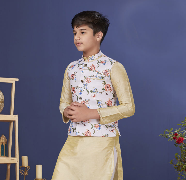 Angasudha Boys' Cream Floral Printed Nehru Jacket