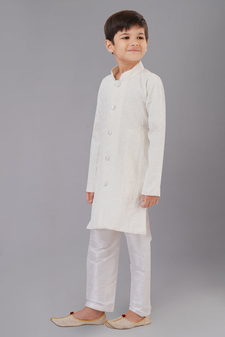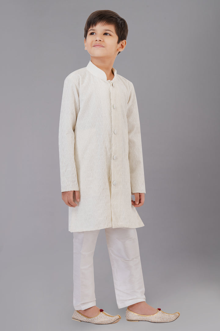 Angasudha Boys' Ivory Textured Kurta Set with White Churidar