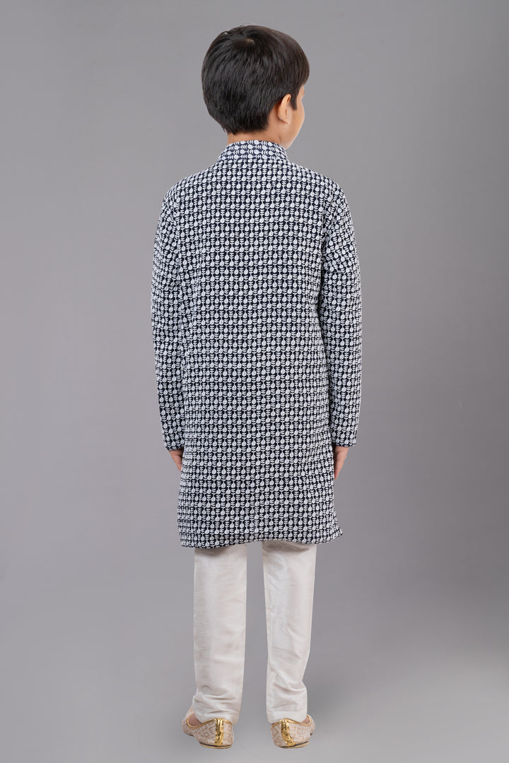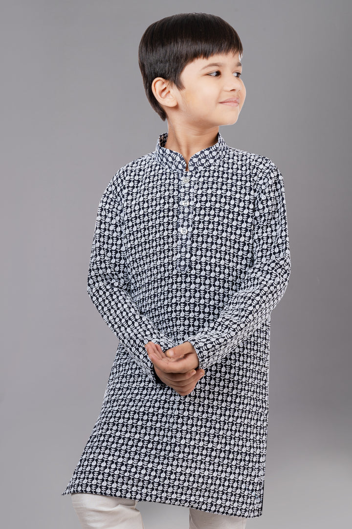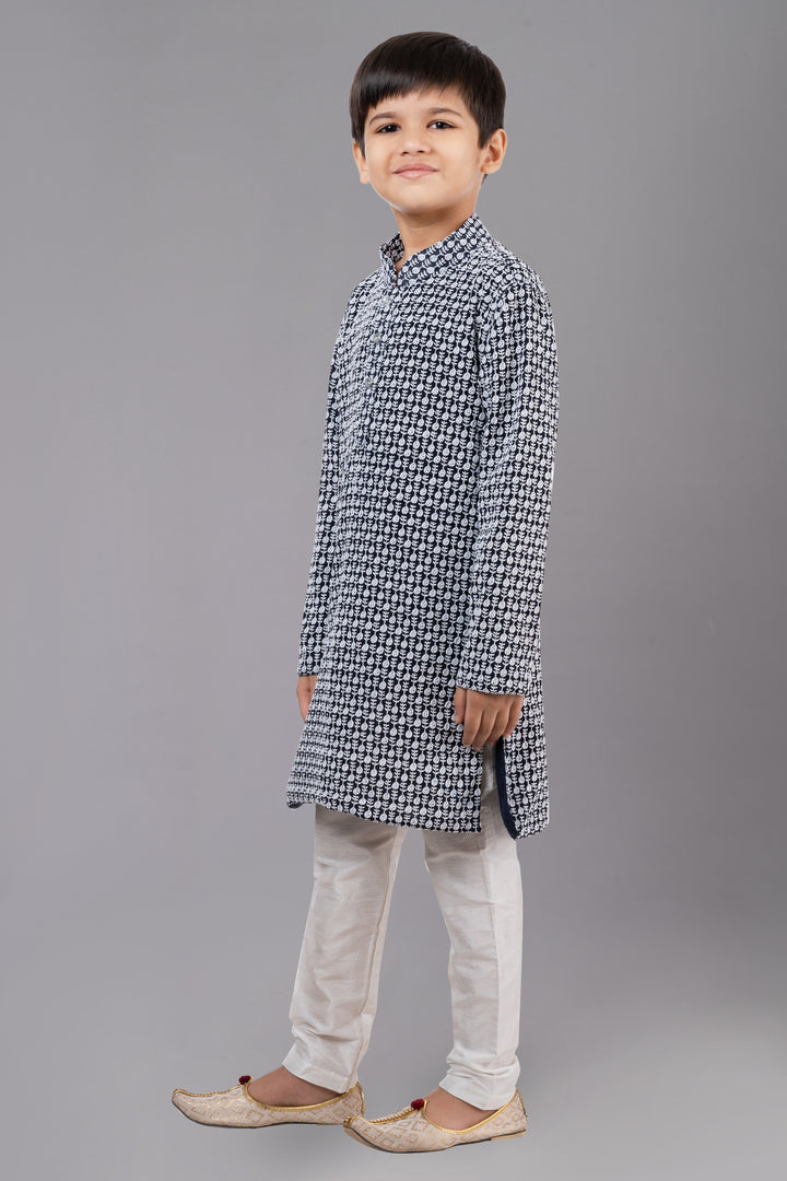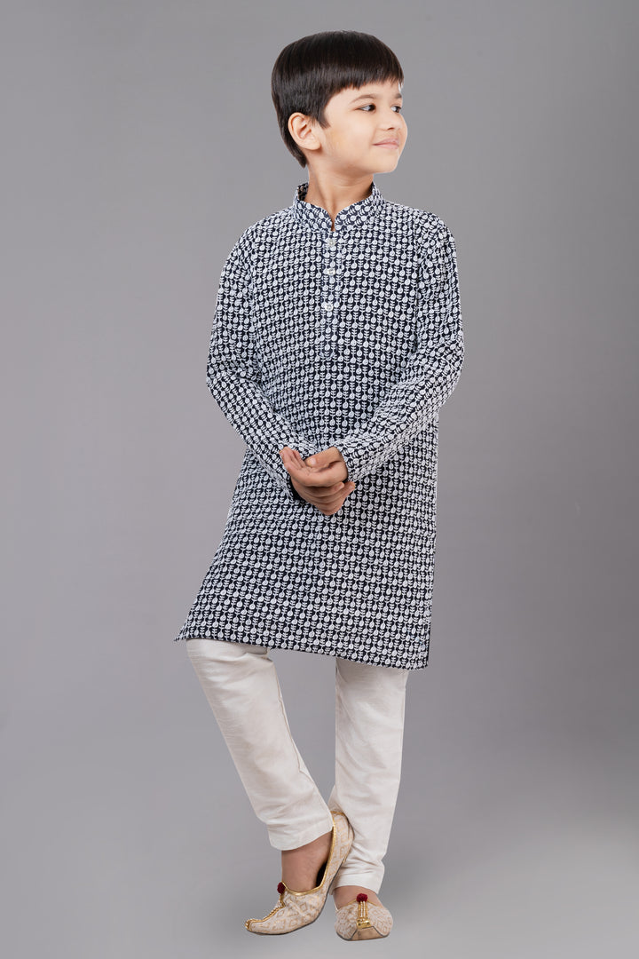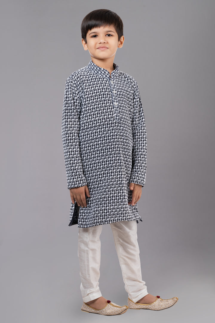 Dress your little one in timeless elegance with this Boys' Midnight Blue Leaf Print Kurta and Cream Churidar Set. The kurta features a classic all-over white leaf motif on a rich midnight blue base, giving it a sophisticated ethnic vibe. Designed with a mandarin collar, front button placket, and a straight cut, this kurta ensures comfort while keeping your child stylish. Paired with a cream churidar, this outfit is perfect for traditional functions, weddings, or festive gatherings.