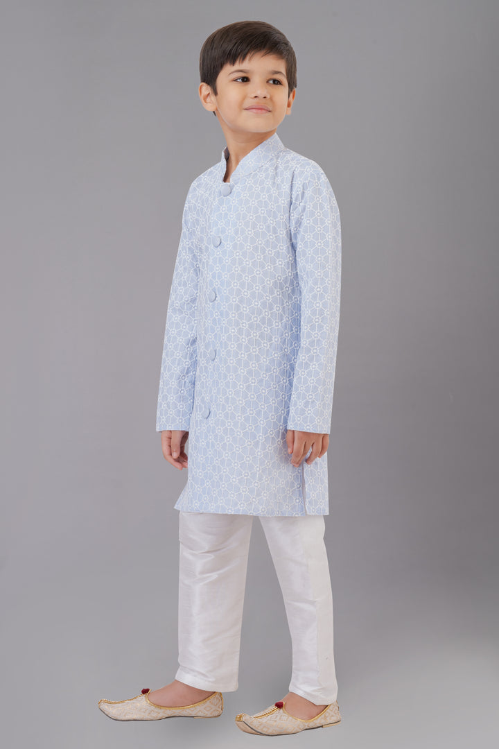 Angasudha Boys' Powder Blue Printed Nehru Jacket Kurta Set with White Pants