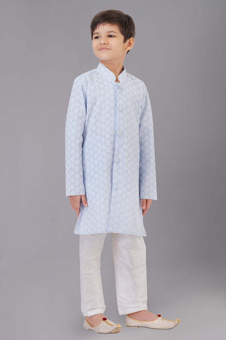 Elevate your little one’s traditional wardrobe with this charming Boys' Powder Blue Printed Nehru Jacket Kurta Set. The kurta features a soothing powder blue hue adorned with a contemporary white geometric print, creating a look that is both modern and rooted in tradition. With a classic Nehru collar and full-front button design, this set offers a sharp yet comfortable fit. Paired with crisp white pants and completed with traditional juttis, it's a perfect choice for weddings, festivals, or formal gatherings.