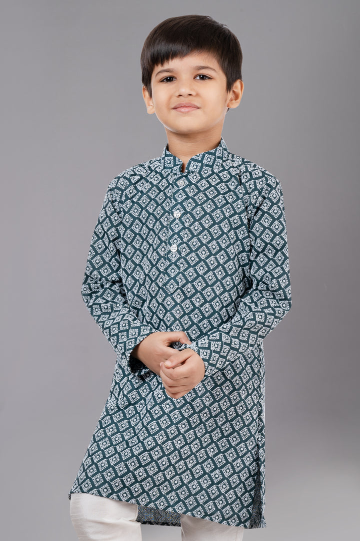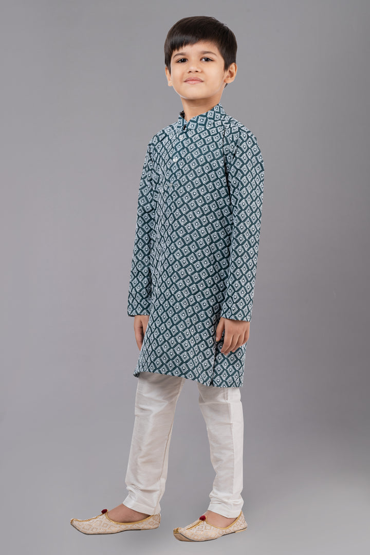 Angasudha Boys' Teal Blue Diamond Print Kurta with Cream Churidar Set