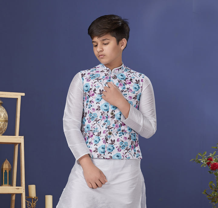 Angasudha Boys' White Nehru Jacket with Blue Floral Print