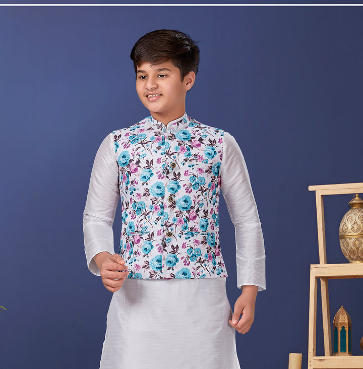 Brighten up your little one’s festive style with this eye-catching White Nehru Jacket featuring Blue Floral Print. Designed with a vibrant mix of turquoise blue and purple floral motifs on a crisp white base, this jacket adds a refreshing touch of elegance to any ethnic outfit. The structured fit, mandarin collar, and contrast buttons give it a dapper look perfect for joyful celebrations.