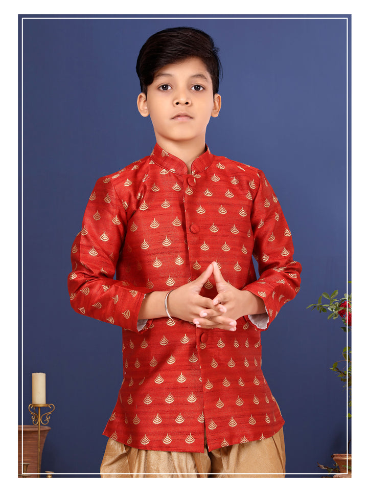 Angasudha Brick Red Brocade Kurta with Golden Dhoti Pants – Boys' Traditional Festive Outfit
