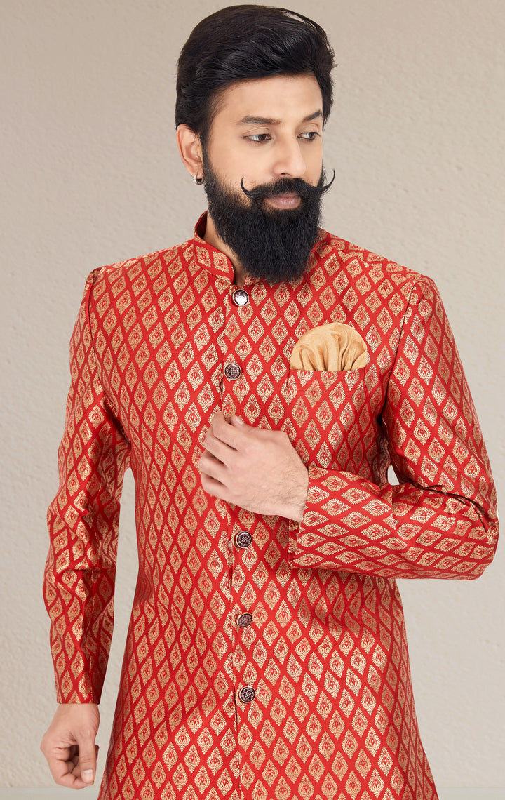 Celebrate opulence in this Angasudha Indo Western set, tailored for grandeur and festive flair. The brick red top features an exquisite diamond-shaped brocade weave in shimmering gold thread, paired with antique buttons and a gold pocket square. Teamed with golden dhoti pants, this ensemble is perfect for traditional celebrations and royal wedding affairs.