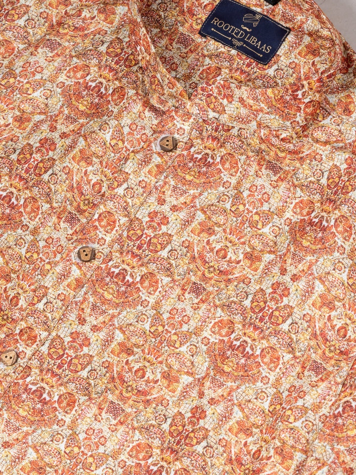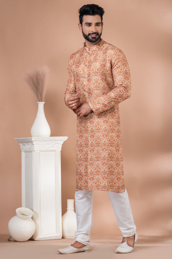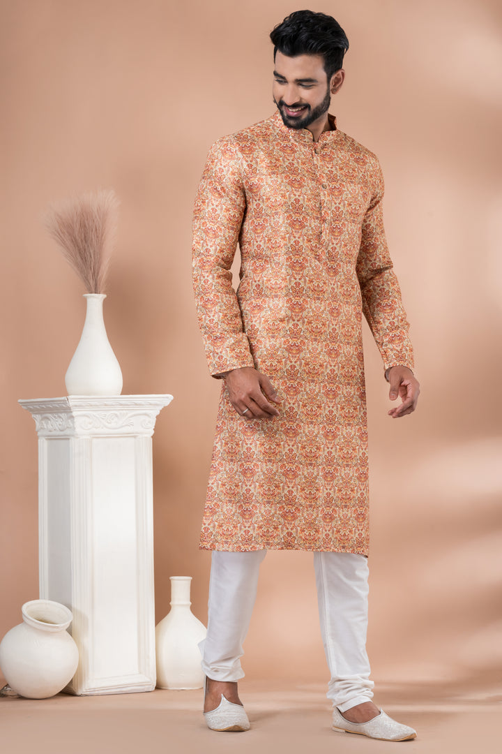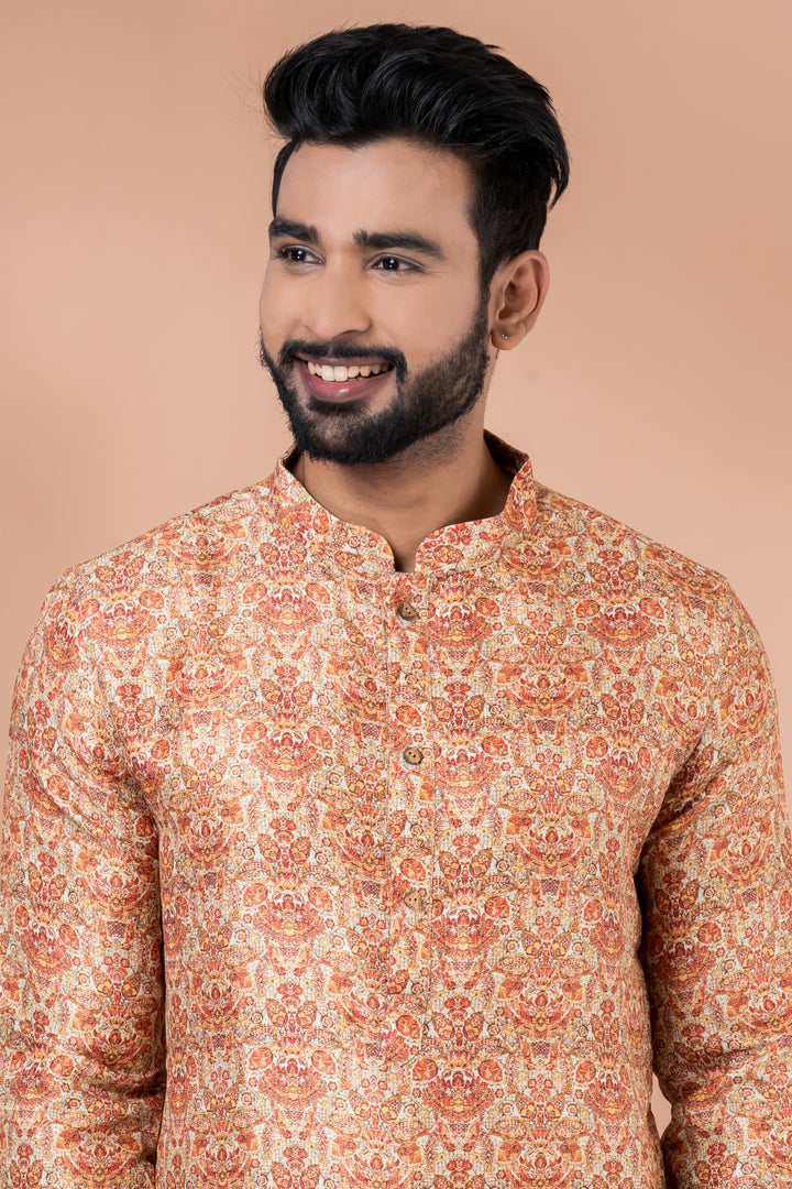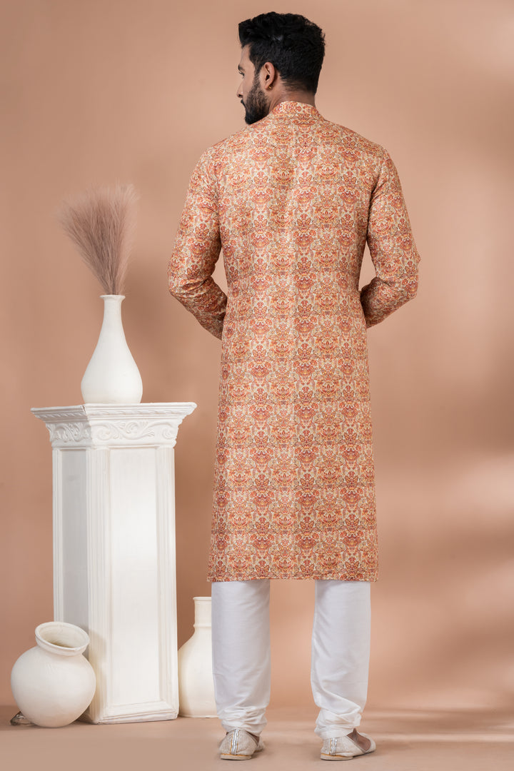 Make a striking statement in the Angasudha Burnt Orange Kurta Set, exquisitely tailored in Banarasi Dhupion Silk. Adorned with rich floral motifs in deep red, antique gold, and soft beige, this kurta showcases a traditional vibe with modern flair. The detailed weave and subtle sheen give it a grand look, perfect for festive evenings and traditional occasions. Paired with a crisp white Dupion Silk pyjama, this ensemble is all about class and cultural pride.