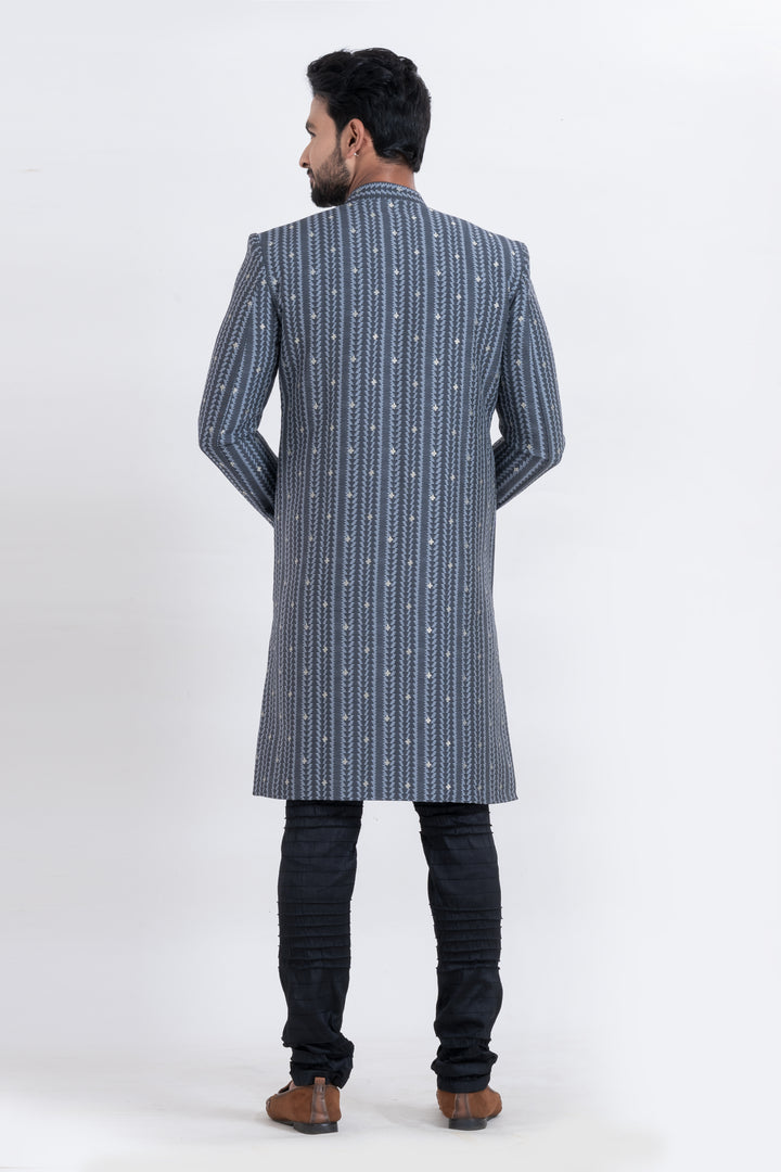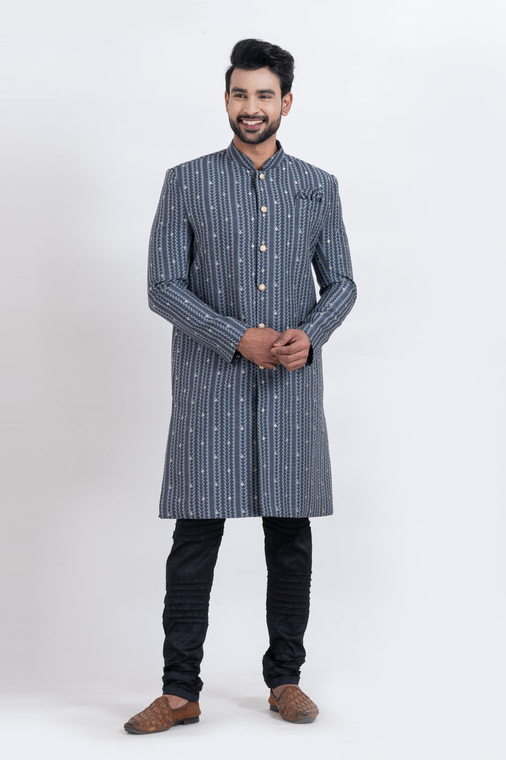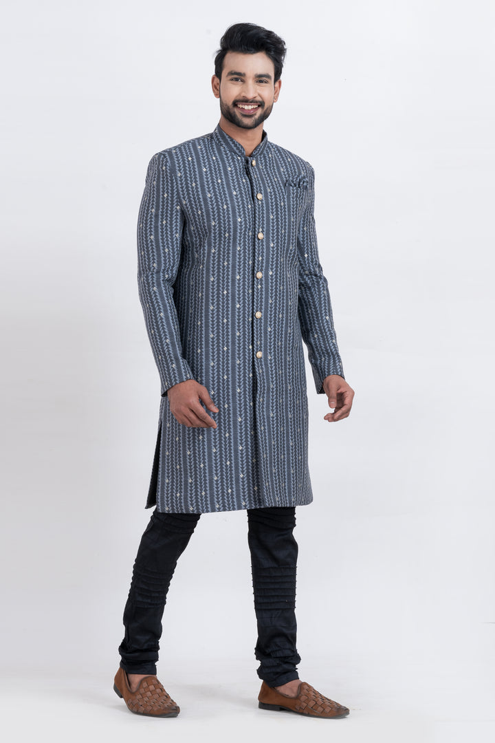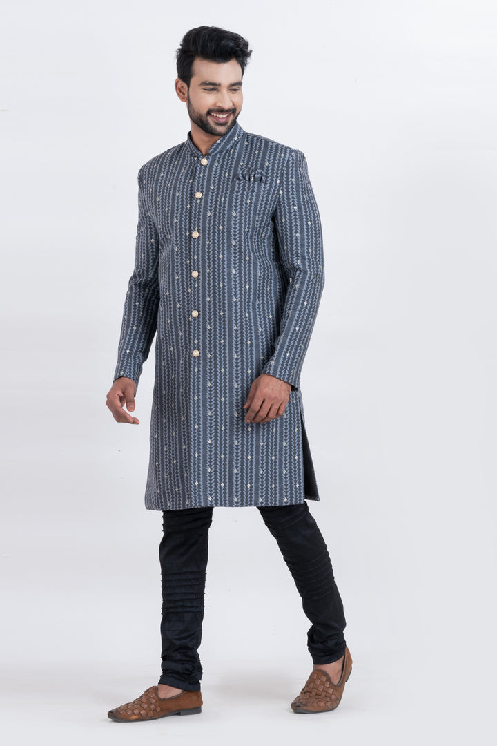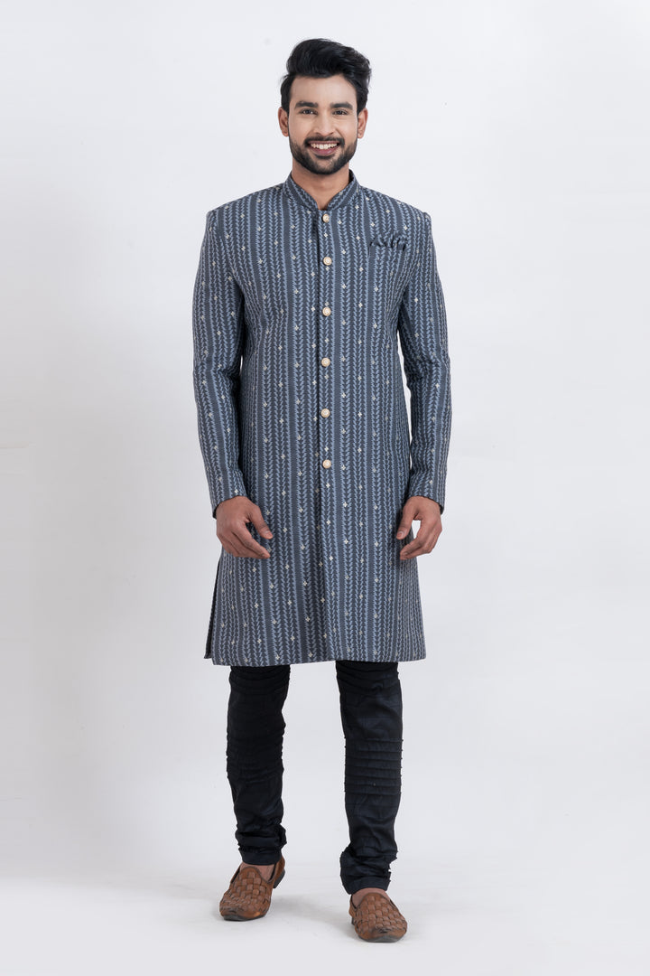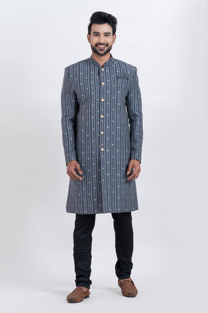 Redefine sophistication with the Charcoal Regal Indo Western Set, a sleek fusion of traditional charm and modern refinement. This ensemble features a deep charcoal-hued jacquard fabric with vertical embroidered patterns and delicate sequin work for a touch of festive sparkle. The structured silhouette, bandhgala collar, and statement golden buttons add royal flair, perfectly balanced with a classic black churidar for a sharp, commanding look.