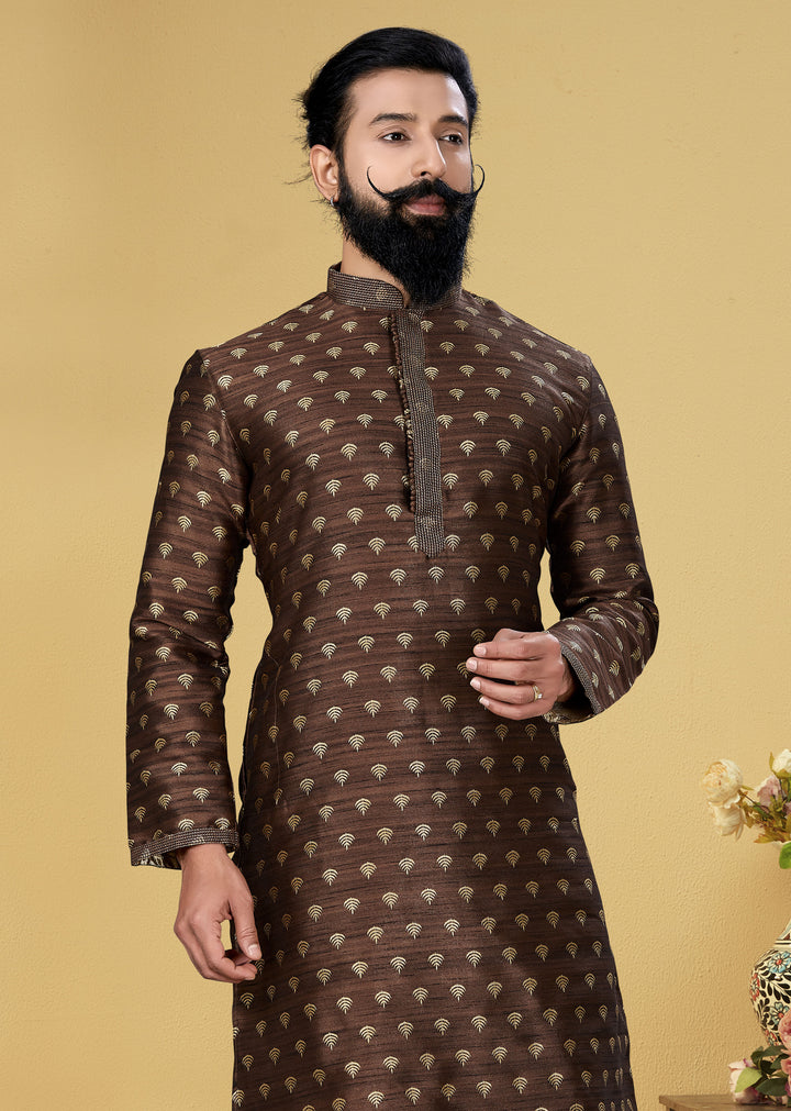 Elevate your ethnic wardrobe with this rich chocolate brown kurta pyjama set, a masterpiece of brocade craftsmanship. The kurta features an elegant all-over golden motif pattern that reflects traditional charm with modern finesse. Designed with a sleek mandarin collar and a detailed button placket, it exudes understated luxury. Paired with a beige-gold art silk churidar pyjama, the ensemble is both refined and festive.