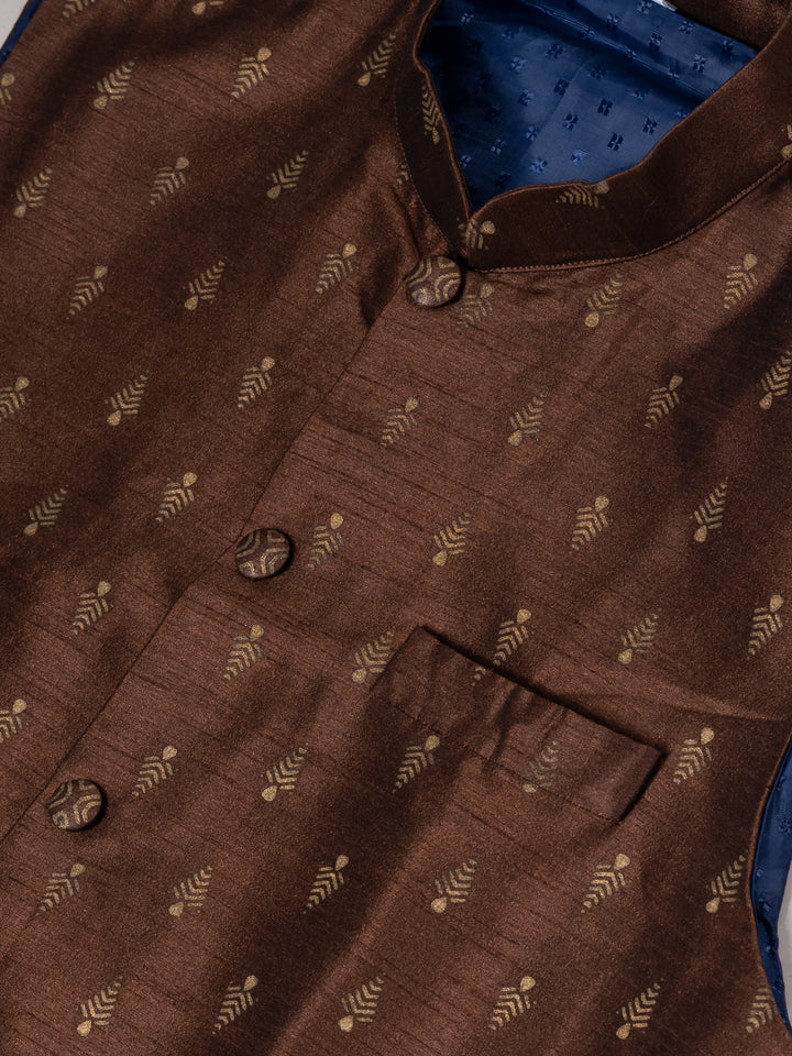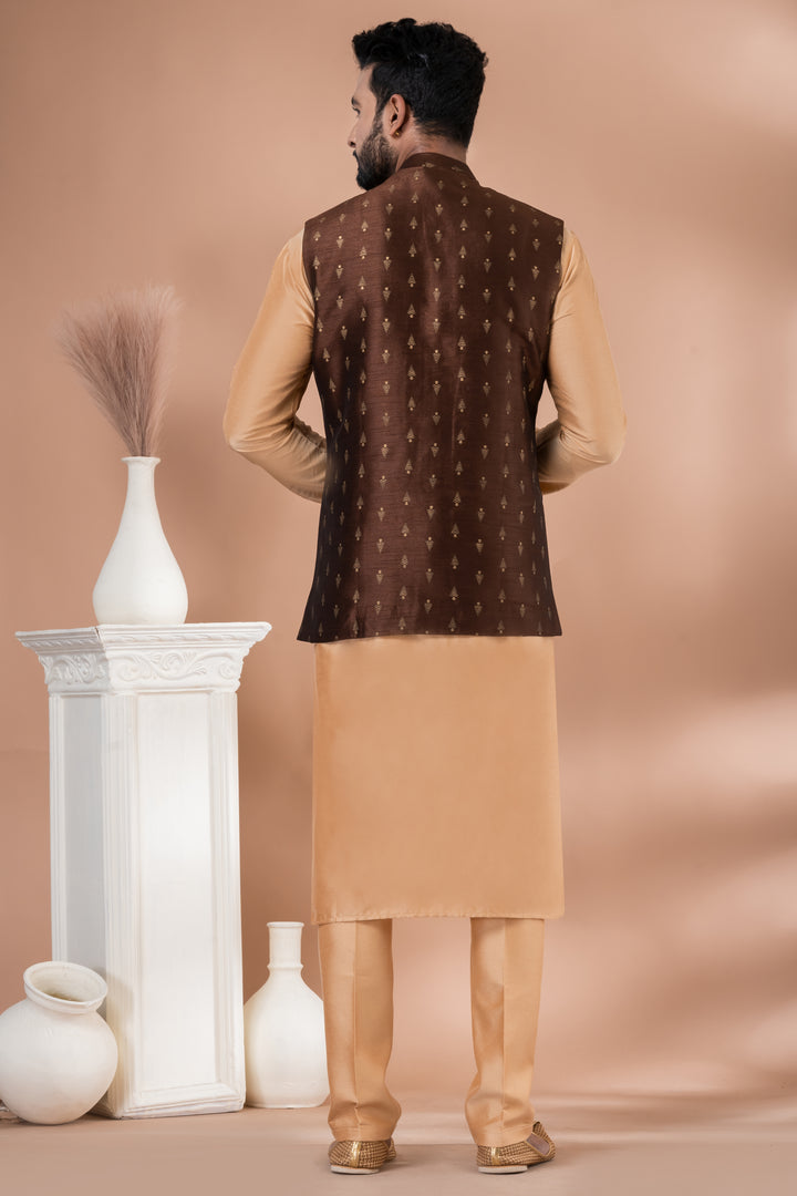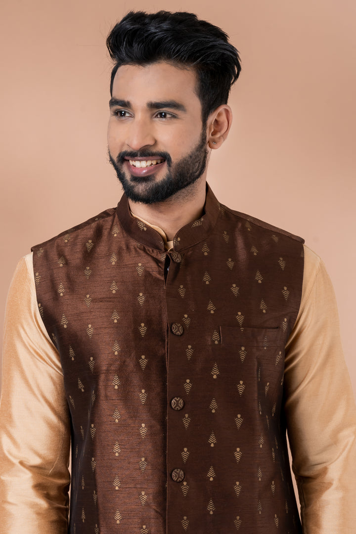 Elevate your ethnic wardrobe with this rich and elegant Chocolate Brown Waistcoat, perfectly paired with a classic Beige Kurta Pyjama set. The kurta and pyjama, tailored from a smooth art silk blend, exude sophistication and comfort. The waistcoat steals the show with its intricate golden motifs woven across a luxurious brown brocade fabric, bringing regal charm to traditional attire.