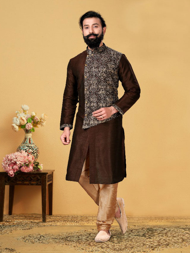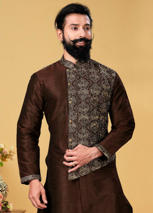 Exude understated luxury with this chocolate brown embroidered asymmetric kurta pyjama set — a perfect blend of earthy tones and intricate detailing. The kurta features a unique asymmetrical front panel richly embroidered with floral and paisley motifs in subtle golden and maroon threads, creating a refined yet bold look. Crafted from glossy art silk, the kurta is complemented by a golden beige churidar pyjama that enhances its festive appeal.
