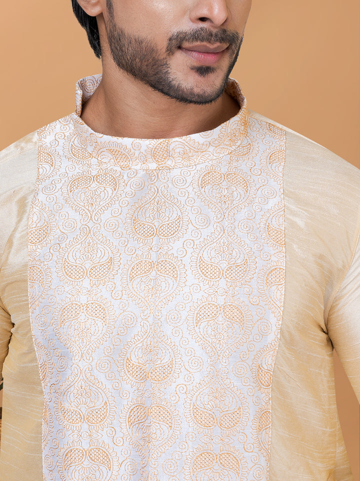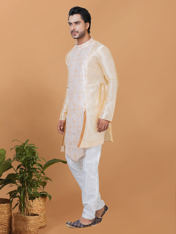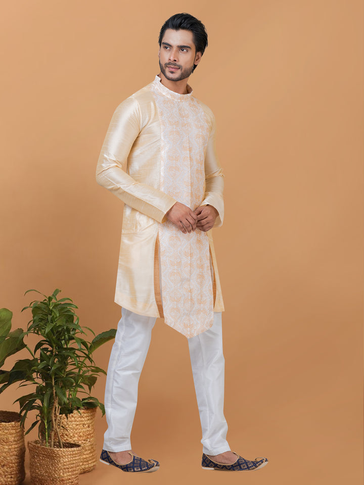 Color: Subtle Beige Kurta with intricately woven cream-gold jacquard front panel