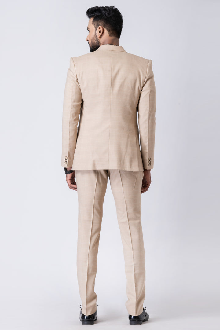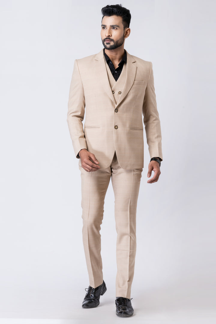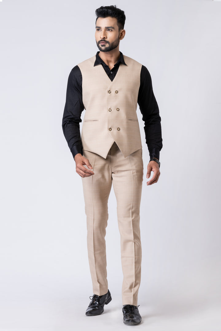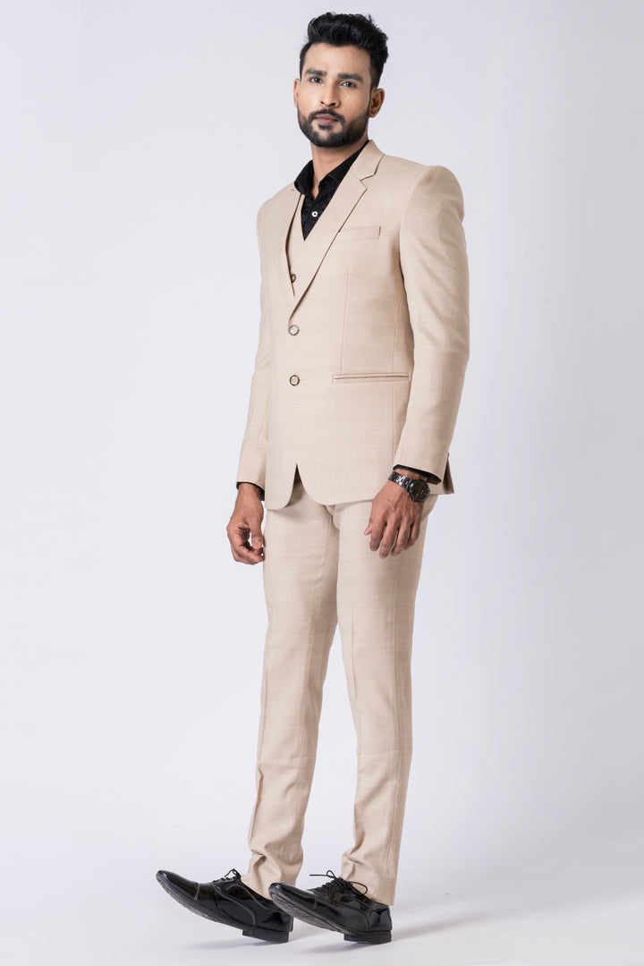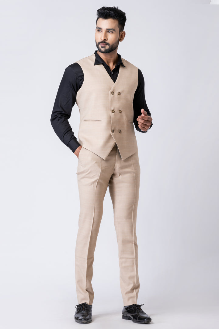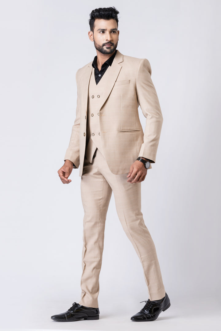 Elevate your formal wardrobe with the Angasudha Classic Beige Tuxedo Suit Set – a sophisticated ensemble designed for modern gentlemen. This 3-piece suit includes a structured blazer, a stylish double-breasted waistcoat, and sharply tailored trousers, all crafted from premium Polystar Mix fabric for a refined look and superior comfort.