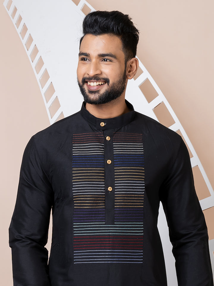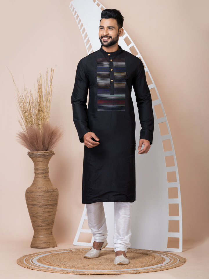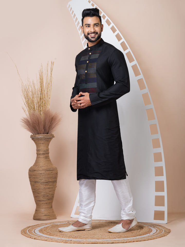 Timeless sophistication meets contemporary flair in this classic black kurta pyjama set. Crafted from a premium fabric, the kurta features a sleek mandarin collar and a striking multi-colored horizontal embroidered panel on the chest that adds a modern twist. Gold-toned buttons further enhance its elegant appeal. Paired with a white churidar, this outfit is perfect for occasions where minimalism and charm go hand in hand.