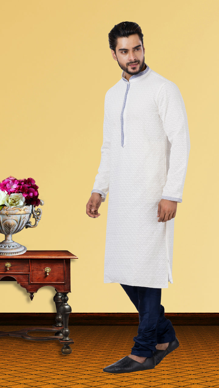 Redefine timeless grace with this classic ivory kurta from Angasudha. Crafted from textured georgette with intricate self-weaving, the ensemble features a contrast blue placket and collar that add a hint of modern flair. Teamed with a navy blue dupion silk pyjama, this set is an ideal choice for elegant festive dressing.