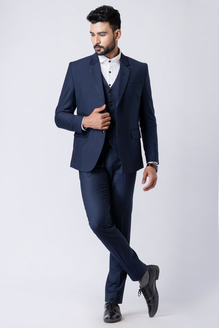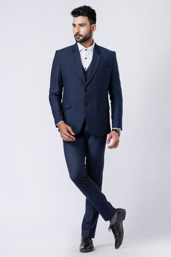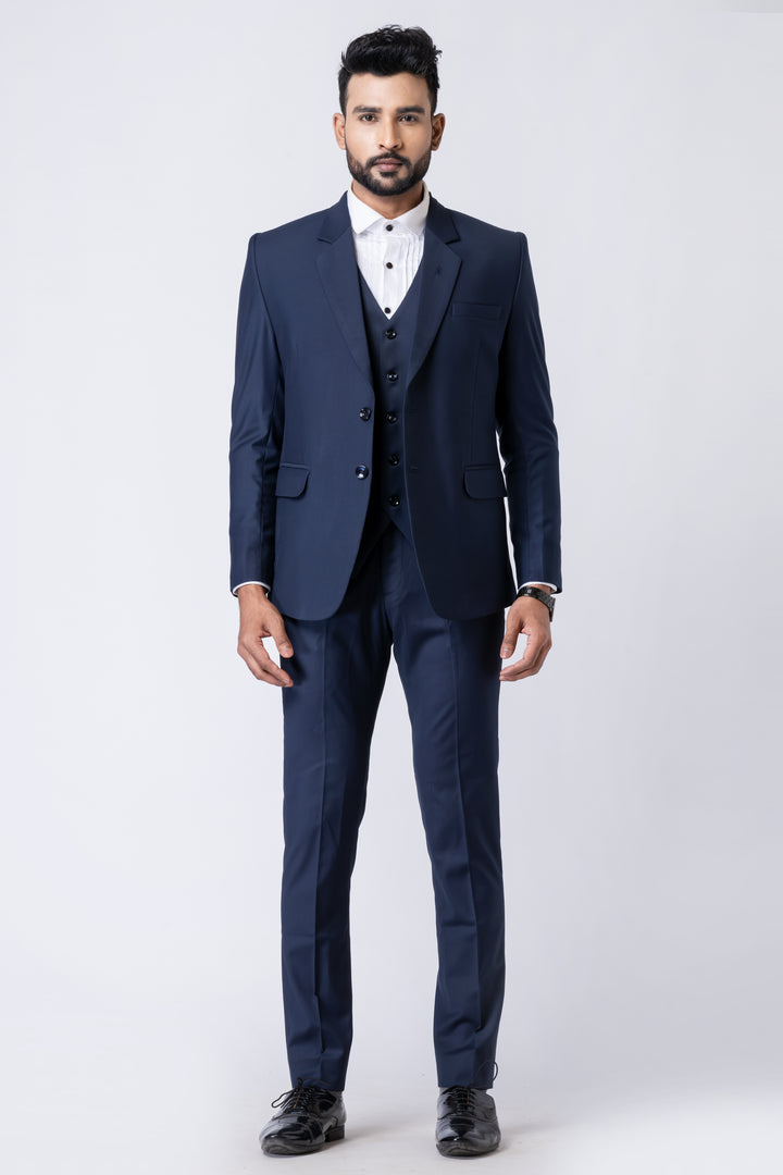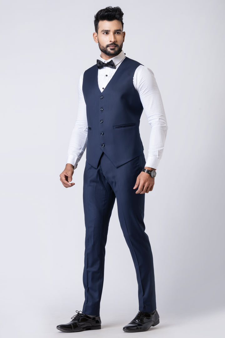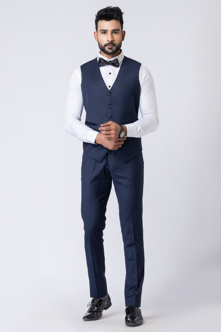 Redefine elegance with the Angasudha Classic Royal Navy Tuxedo Suit Set – tailored to make a lasting impression at any formal gathering. Made from premium Polystar Mix fabric, this 3-piece tuxedo offers a rich navy hue with a clean silhouette comprising a two-button blazer, a coordinating waistcoat, and sharply tapered trousers.