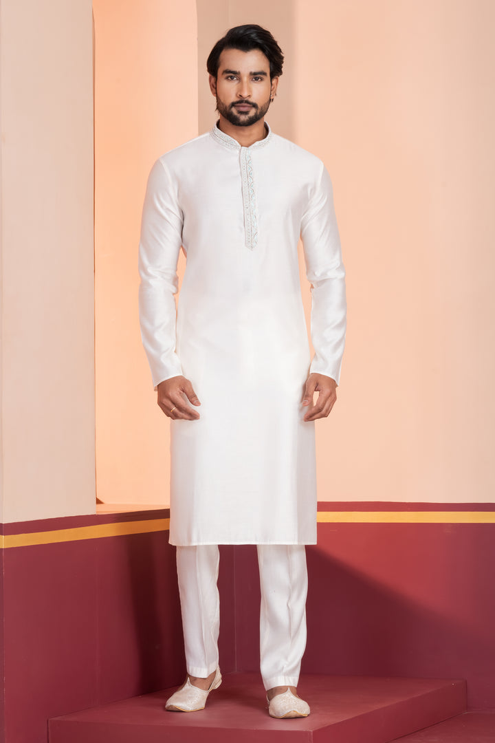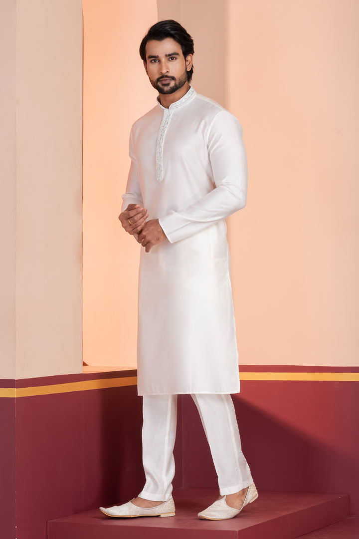 Redefine sophistication with this Classic White Kurta Pyjama Set, a timeless ethnic wear crafted for elegance and grace.