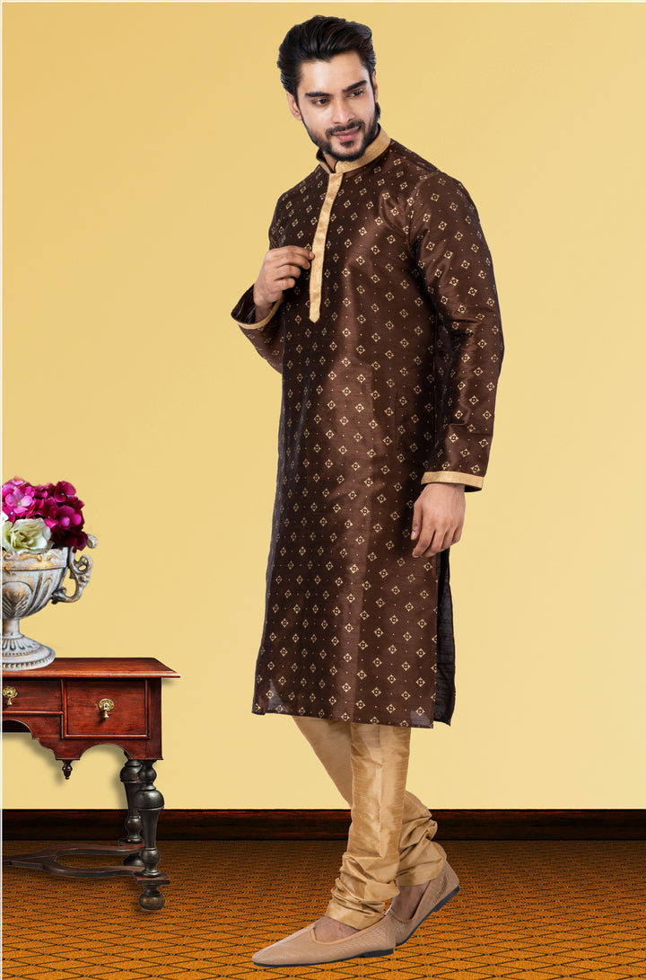 Drape yourself in regal flair with this Cocoa Brown Dupion Silk kurta, beautifully adorned with delicate golden motifs. The contrast gold placket, collar, and cuffs add a luxurious edge, while the Golden Dupion Silk pyjama completes the ensemble with finesse. A powerful choice for men who appreciate bold, classic tradition.